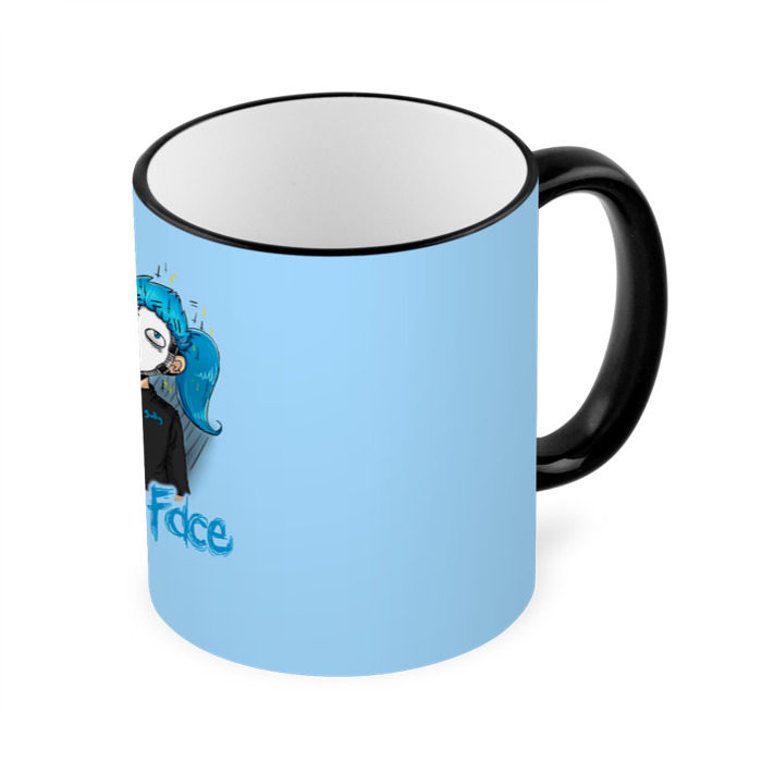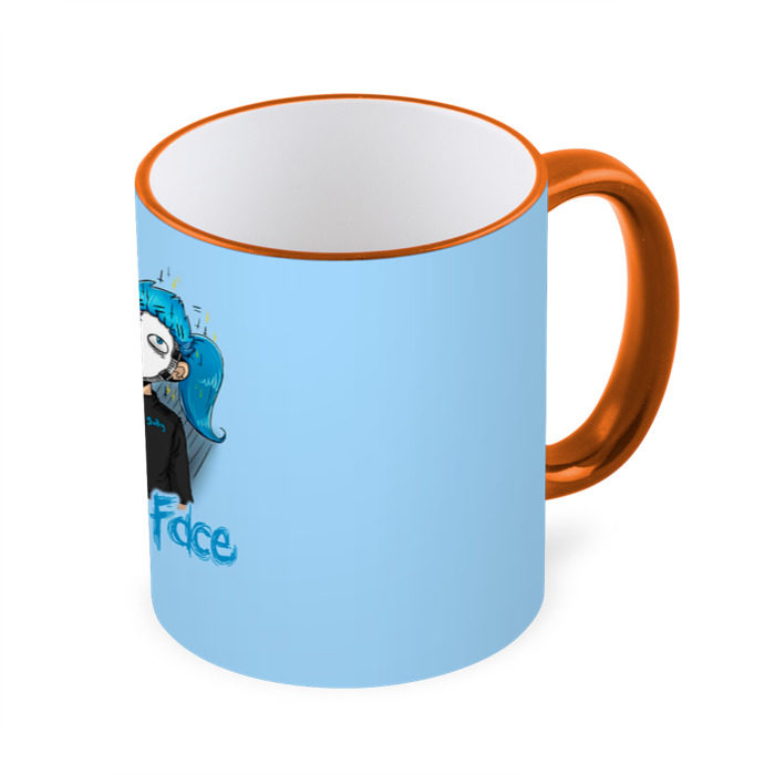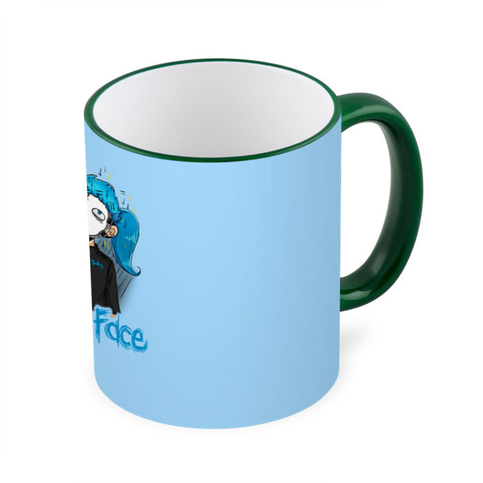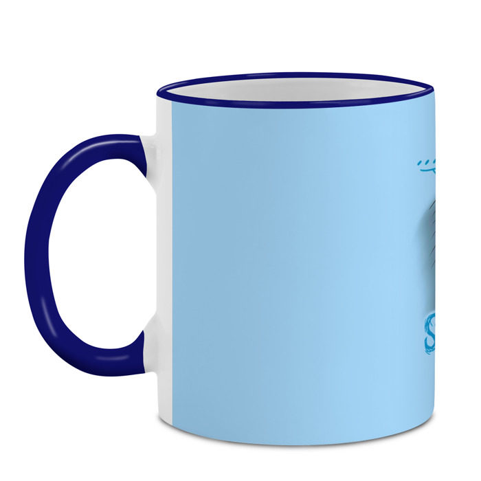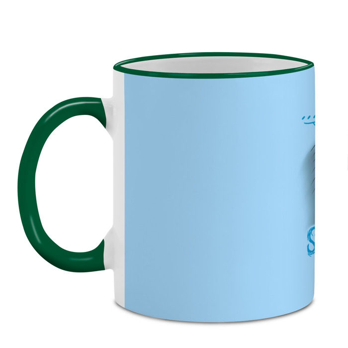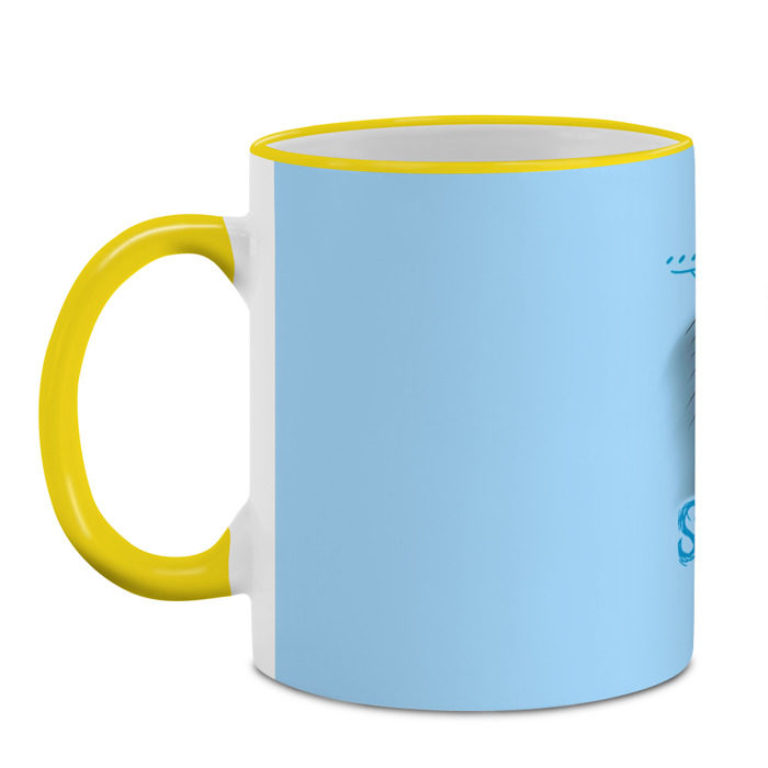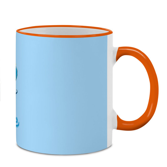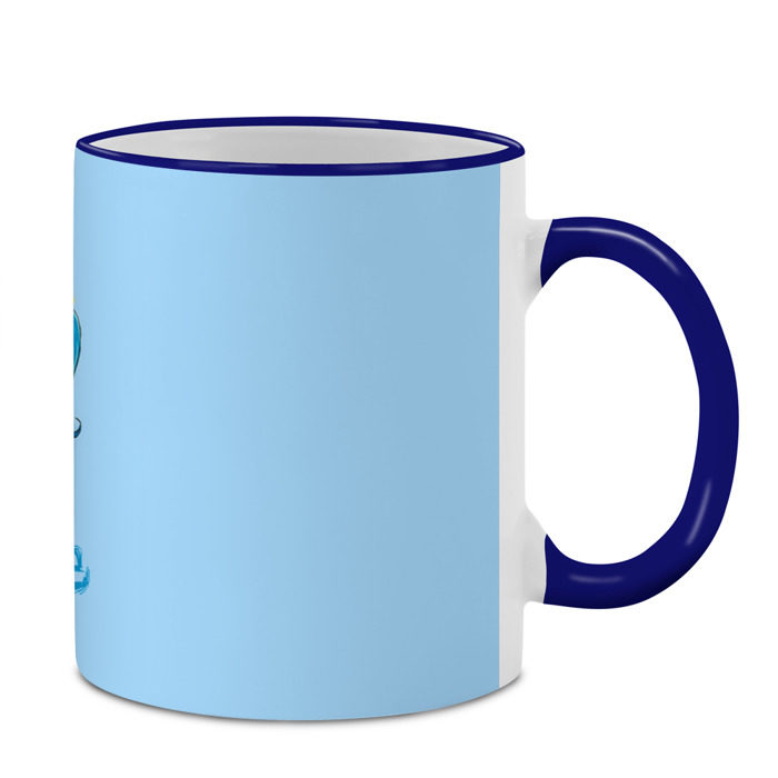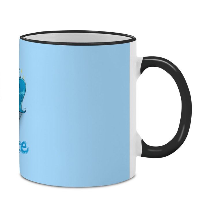 Кружка с принтом, который наносится по всей внешней поверхности, кроме прямоугольника у ручки. У кружки цветной ободок сверху и ручка. Можно заказать со своим дизайном.