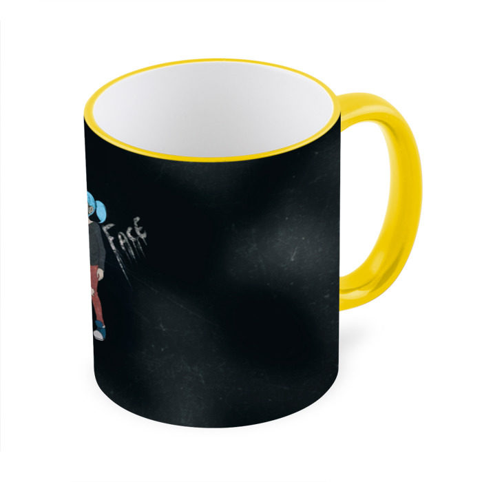Кружка с принтом, который наносится по всей внешней поверхности, кроме прямоугольника у ручки. У кружки цветной ободок сверху и ручка. Можно заказать со своим дизайном.
