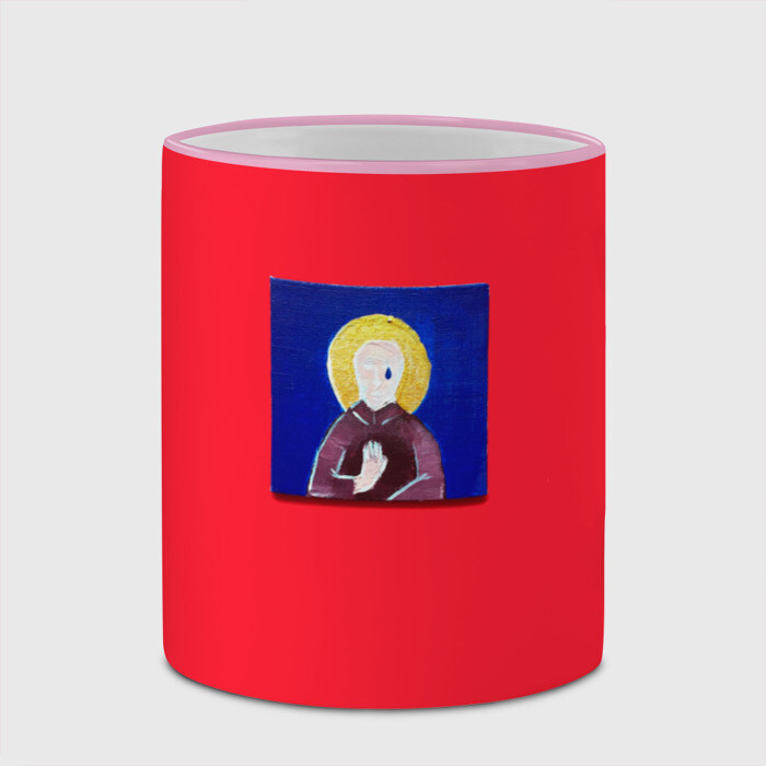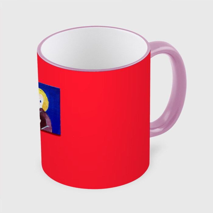 Кружка с принтом, который наносится по всей внешней поверхности, кроме прямоугольника у ручки. У кружки цветной ободок сверху и ручка. Можно заказать со своим дизайном.