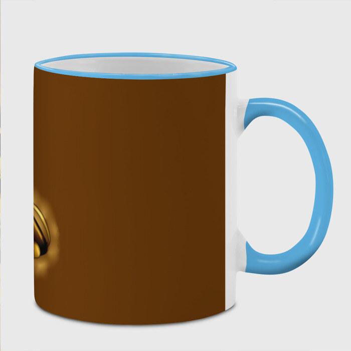 Кружка с принтом, который наносится по всей внешней поверхности, кроме прямоугольника у ручки. У кружки цветной ободок сверху и ручка. Можно заказать со своим дизайном.