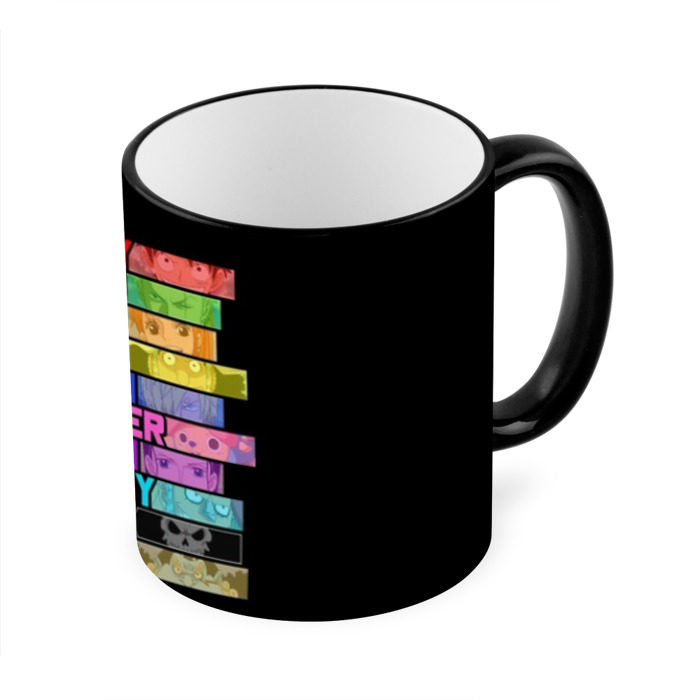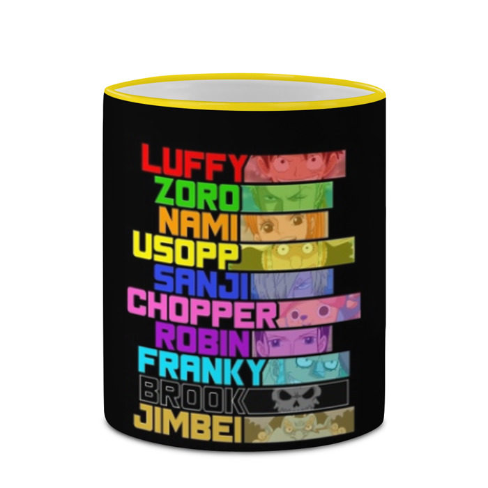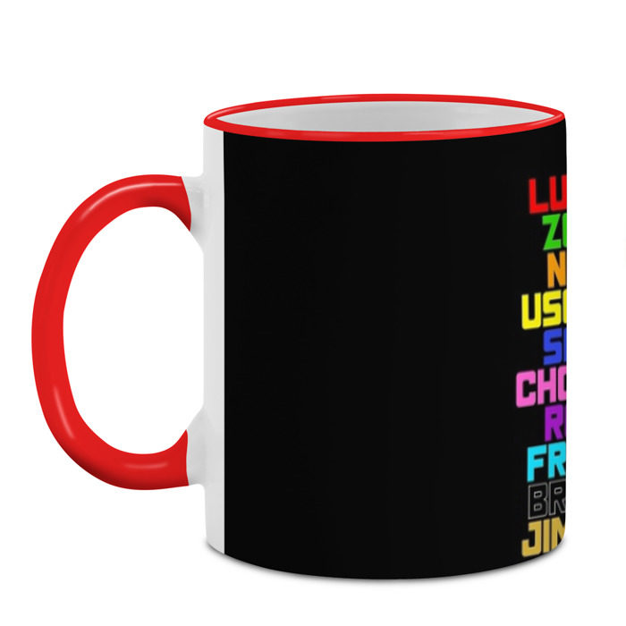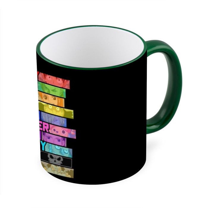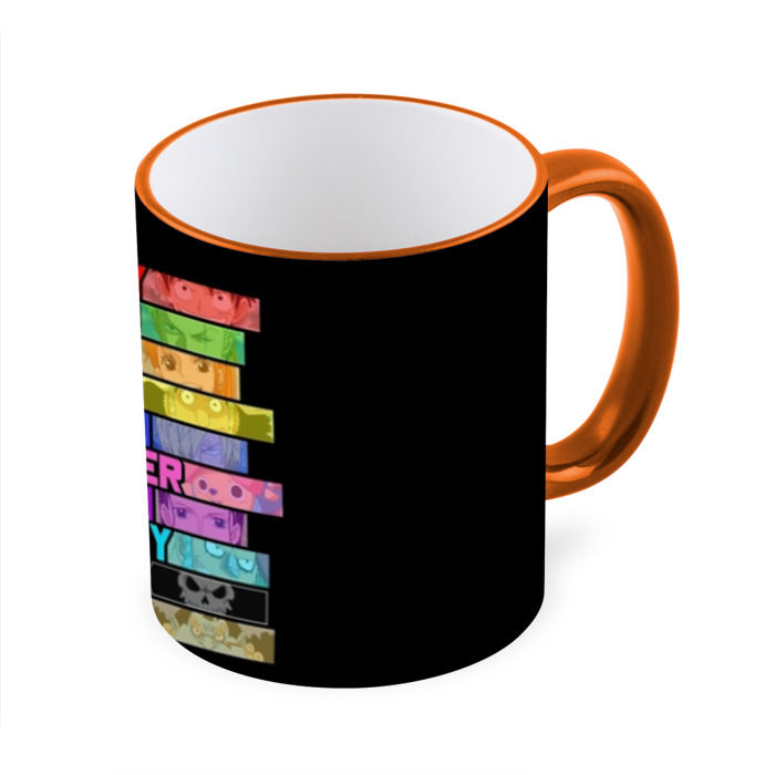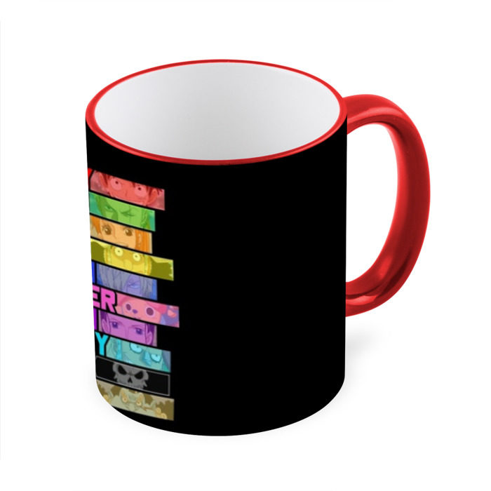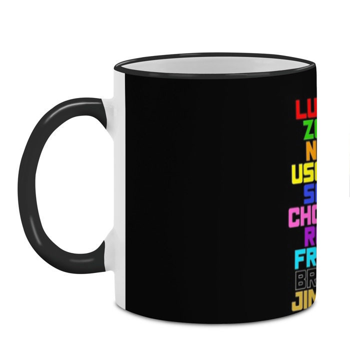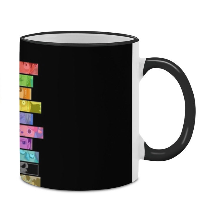 Кружка с принтом, который наносится по всей внешней поверхности, кроме прямоугольника у ручки. У кружки цветной ободок сверху и ручка. Можно заказать со своим дизайном.