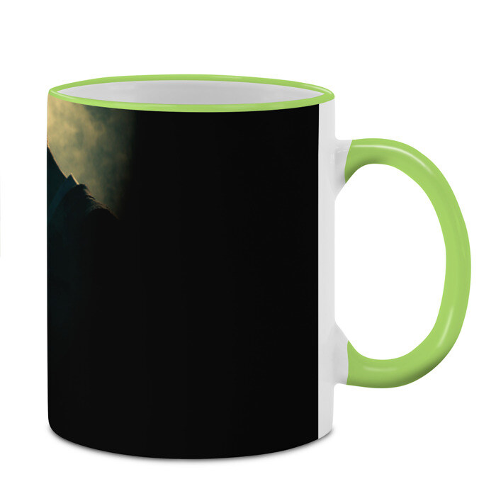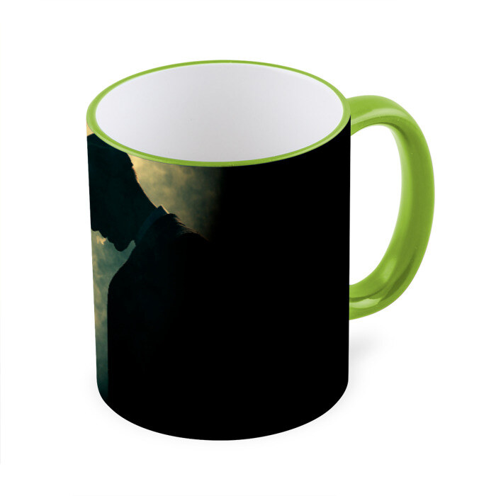 Кружка с принтом, который наносится по всей внешней поверхности, кроме прямоугольника у ручки. У кружки цветной ободок сверху и ручка. Можно заказать со своим дизайном.