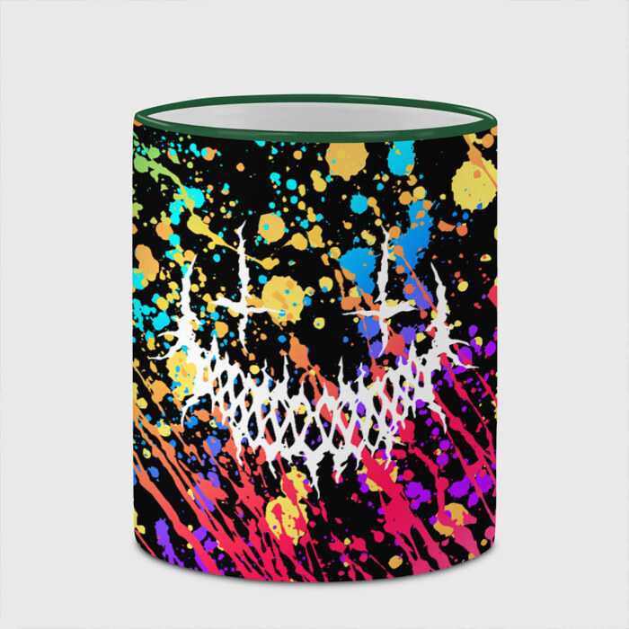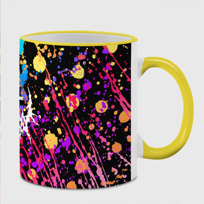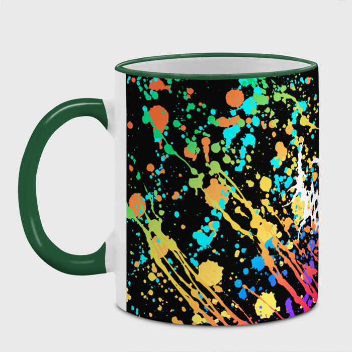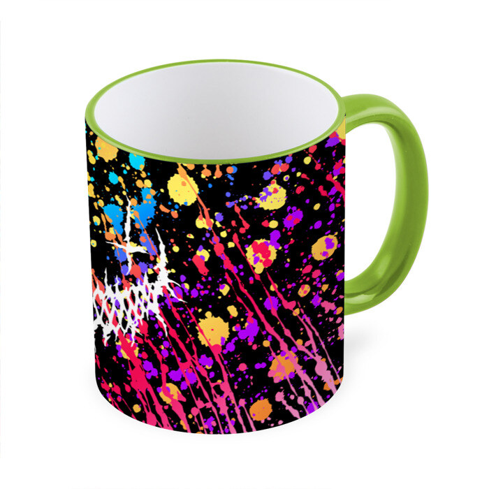 Кружка с принтом, который наносится по всей внешней поверхности, кроме прямоугольника у ручки. У кружки цветной ободок сверху и ручка. Можно заказать со своим дизайном.