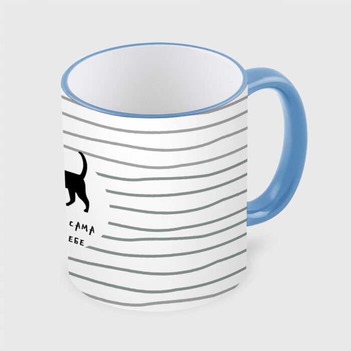 Кружка с принтом, который наносится по всей внешней поверхности, кроме прямоугольника у ручки. У кружки цветной ободок сверху и ручка. Можно заказать со своим дизайном.
