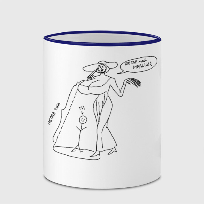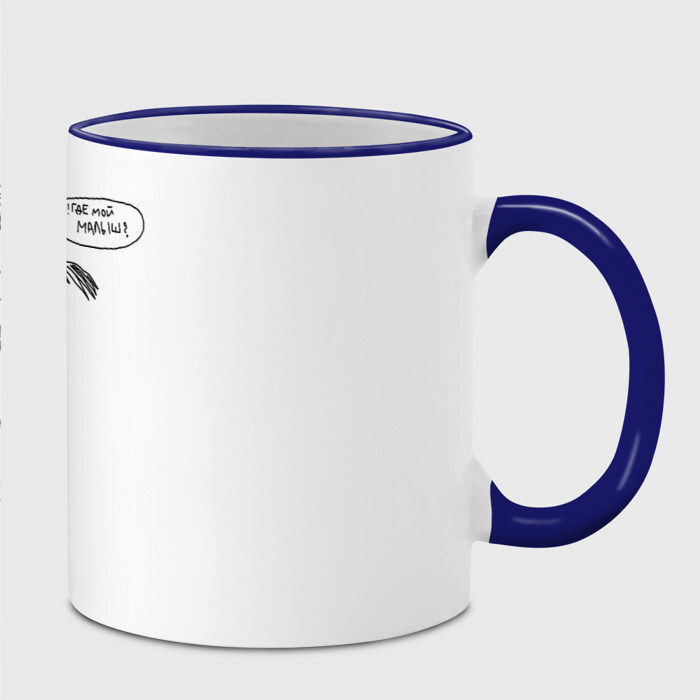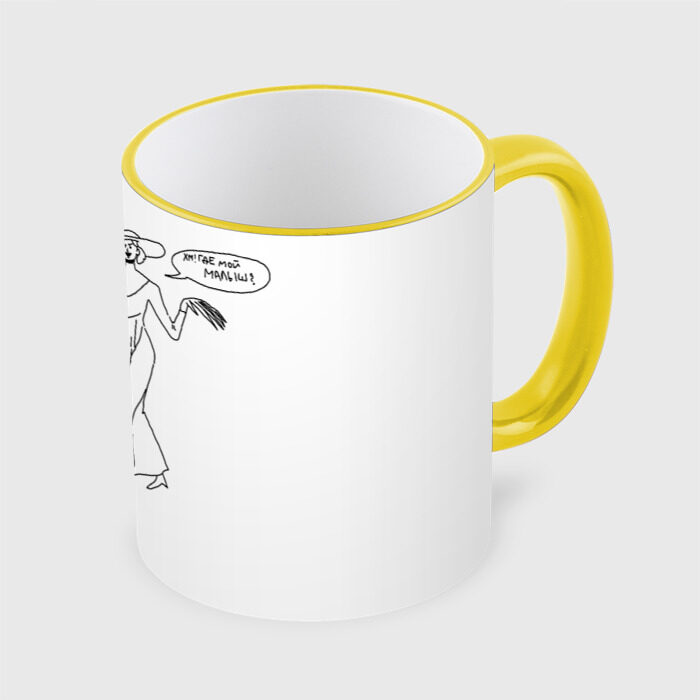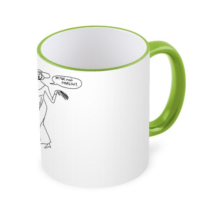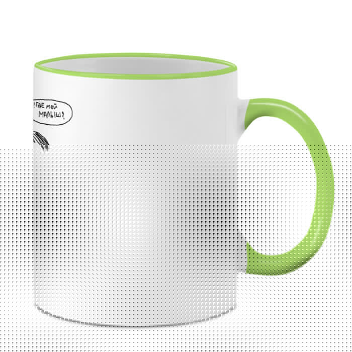Кружка с принтом, который наносится по всей внешней поверхности, кроме прямоугольника у ручки. У кружки цветной ободок сверху и ручка. Можно заказать со своим дизайном.
