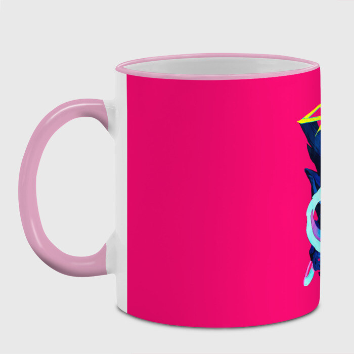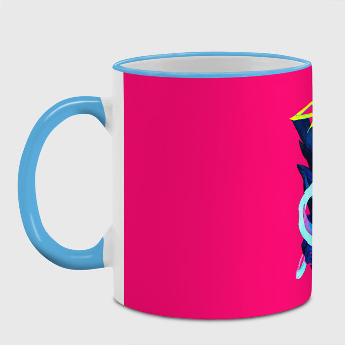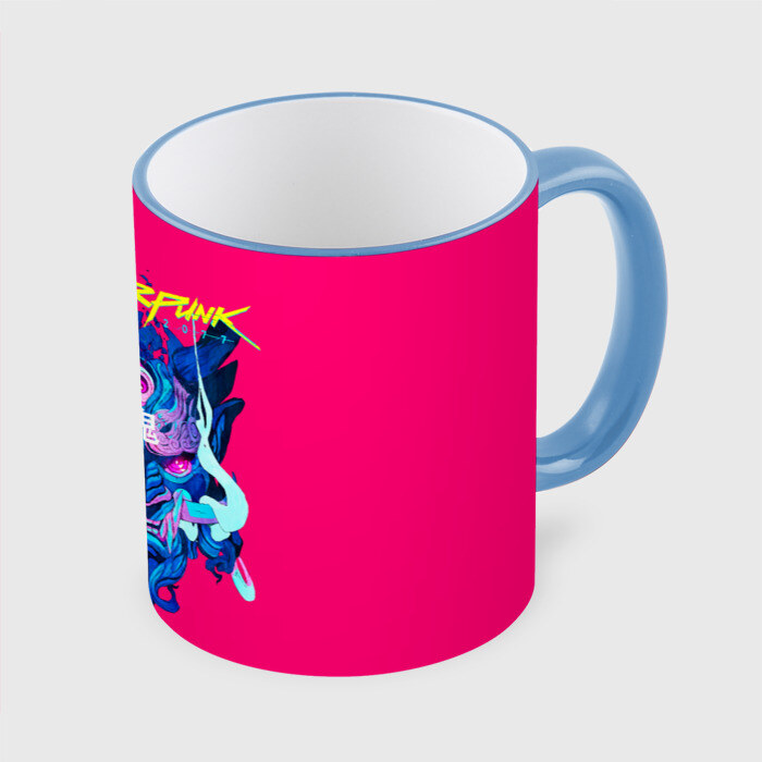 Кружка с принтом, который наносится по всей внешней поверхности, кроме прямоугольника у ручки. У кружки цветной ободок сверху и ручка. Можно заказать со своим дизайном.