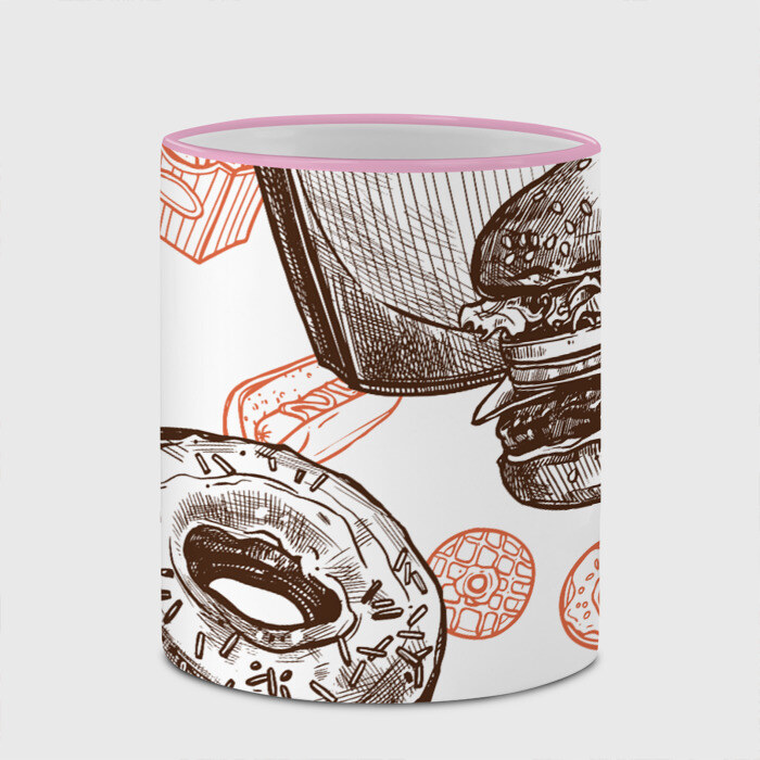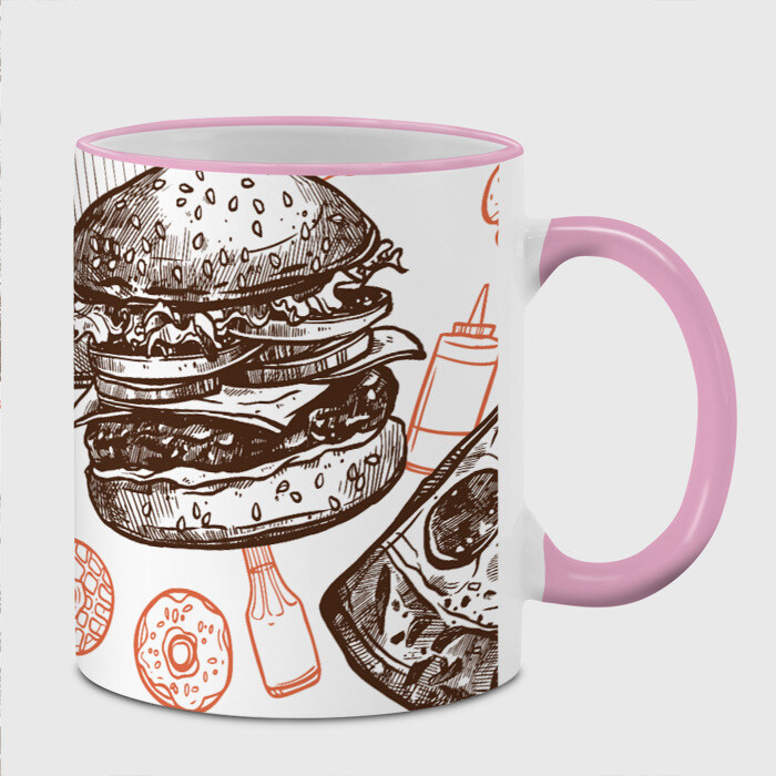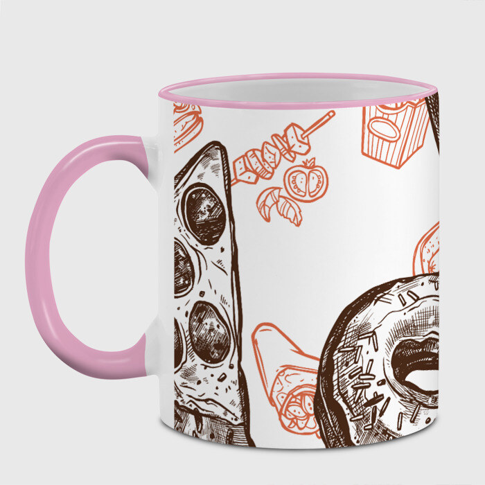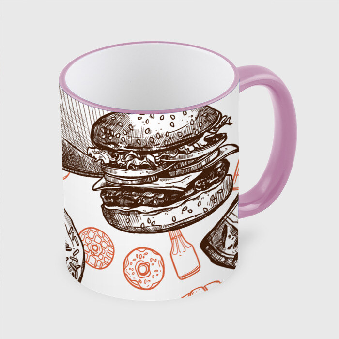Кружка с принтом, который наносится по всей внешней поверхности, кроме прямоугольника у ручки. У кружки цветной ободок сверху и ручка. Можно заказать со своим дизайном.