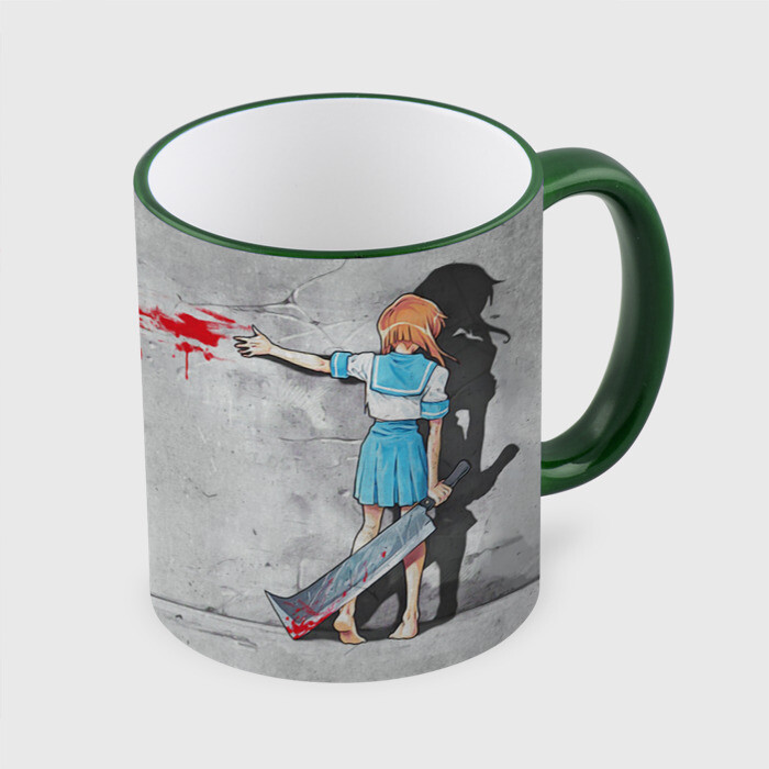 Кружка с принтом, который наносится по всей внешней поверхности, кроме прямоугольника у ручки. У кружки цветной ободок сверху и ручка. Можно заказать со своим дизайном.
