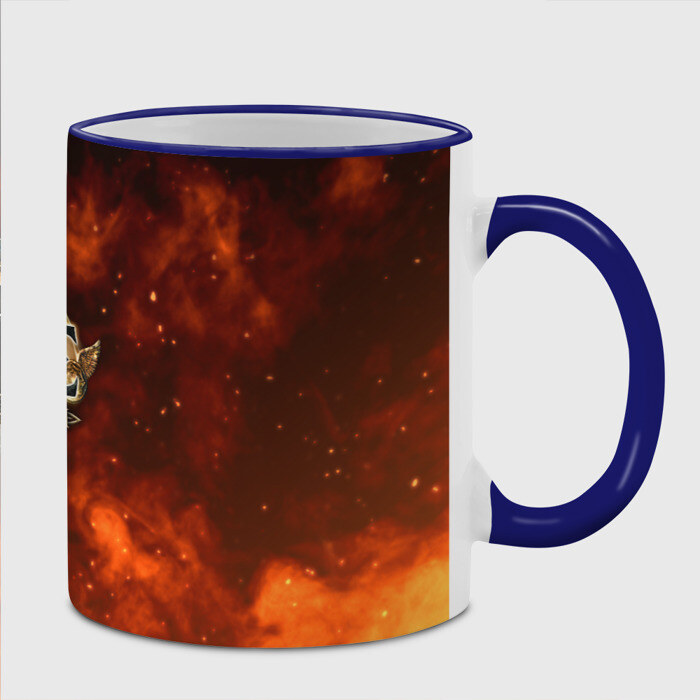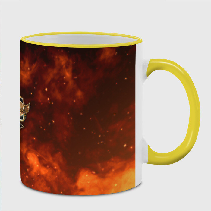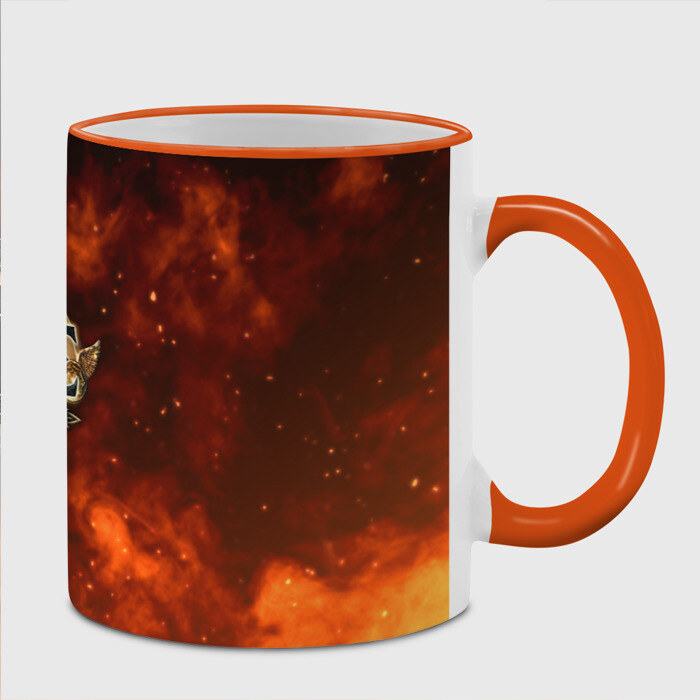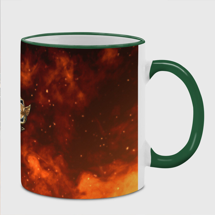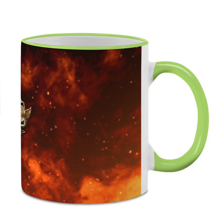 Кружка с принтом, который наносится по всей внешней поверхности, кроме прямоугольника у ручки. У кружки цветной ободок сверху и ручка. Можно заказать со своим дизайном.