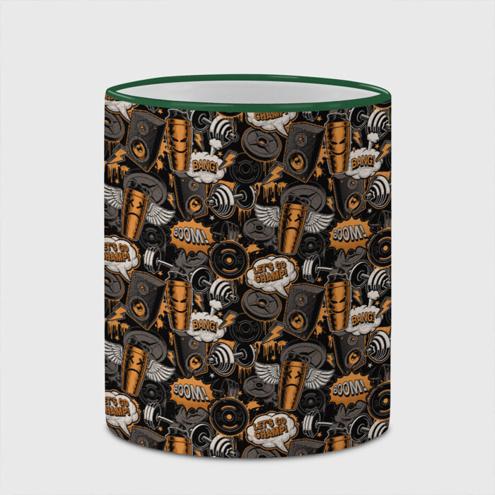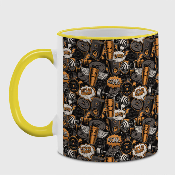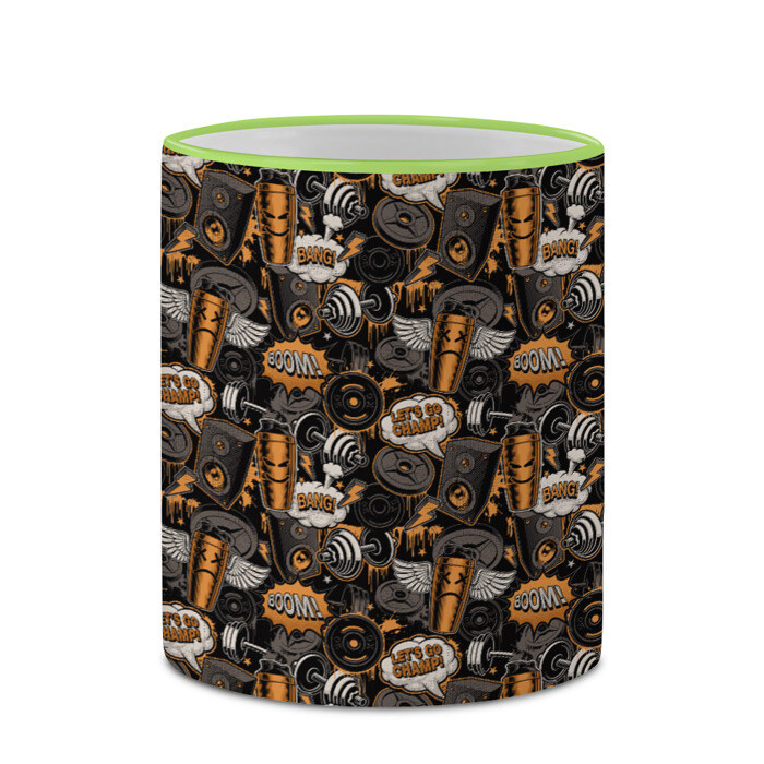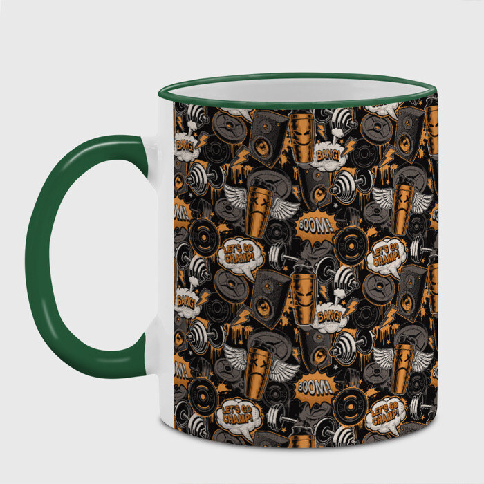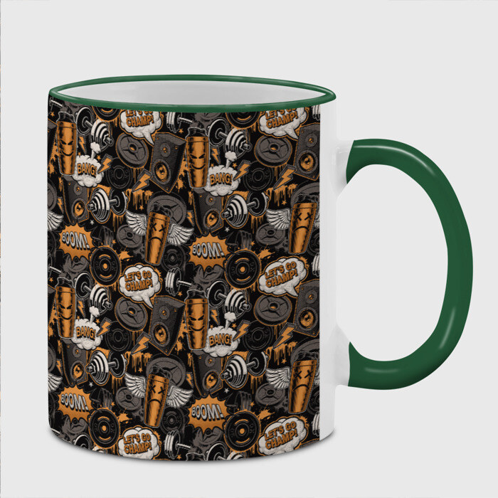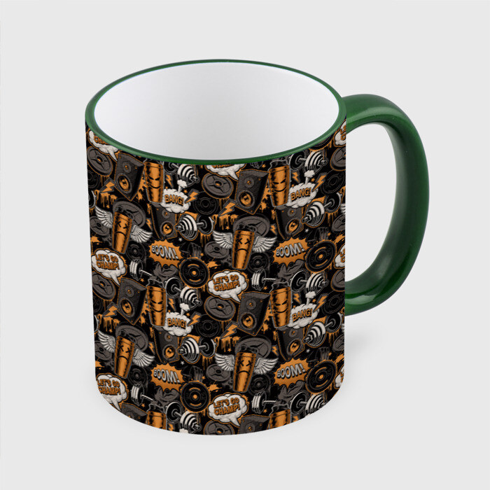 Кружка с принтом, который наносится по всей внешней поверхности, кроме прямоугольника у ручки. У кружки цветной ободок сверху и ручка. Можно заказать со своим дизайном.