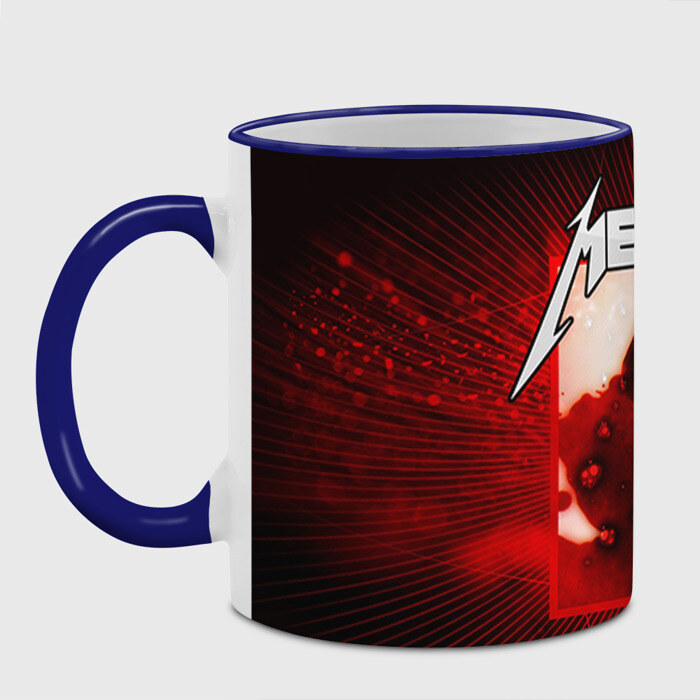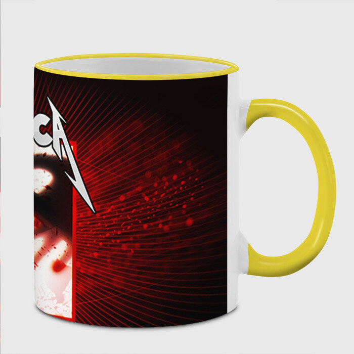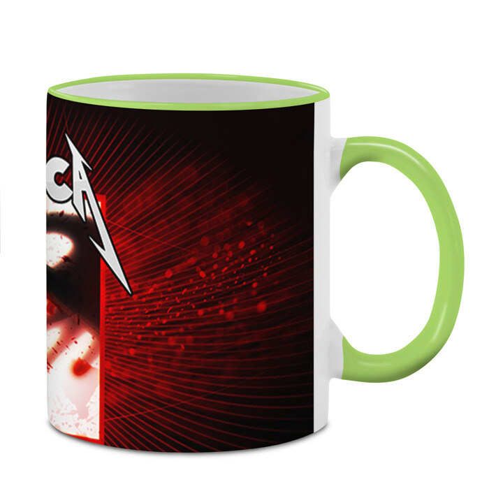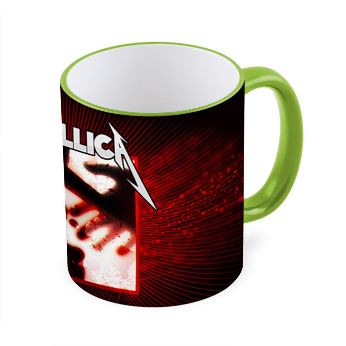Кружка с принтом, который наносится по всей внешней поверхности, кроме прямоугольника у ручки. У кружки цветной ободок сверху и ручка. Можно заказать со своим дизайном.