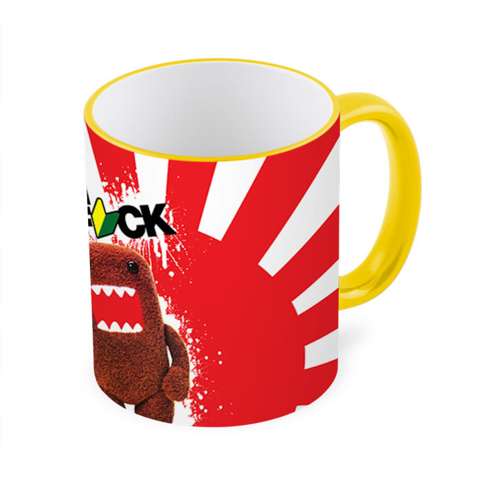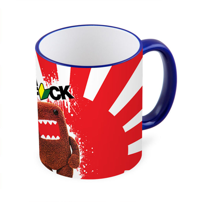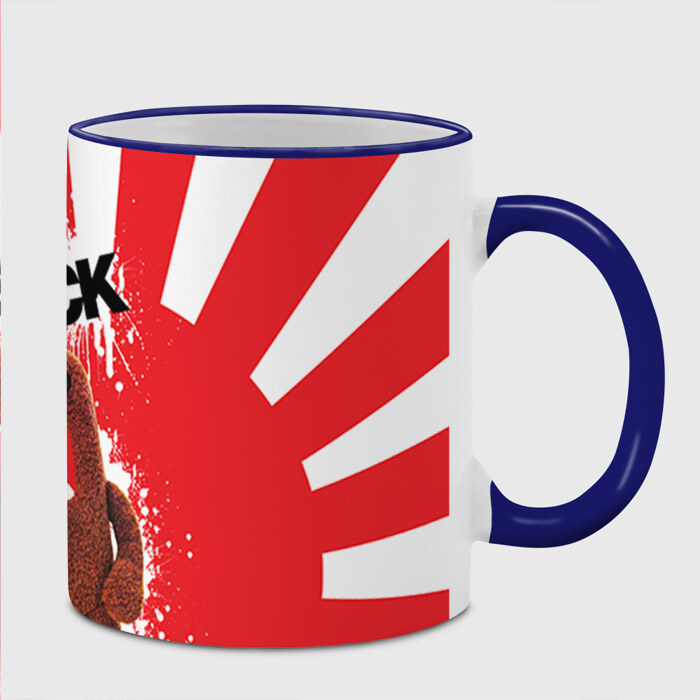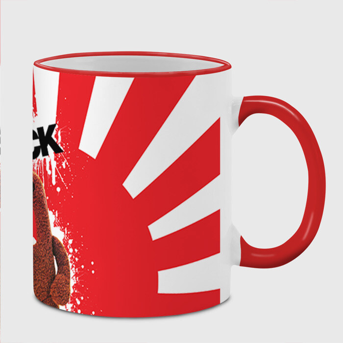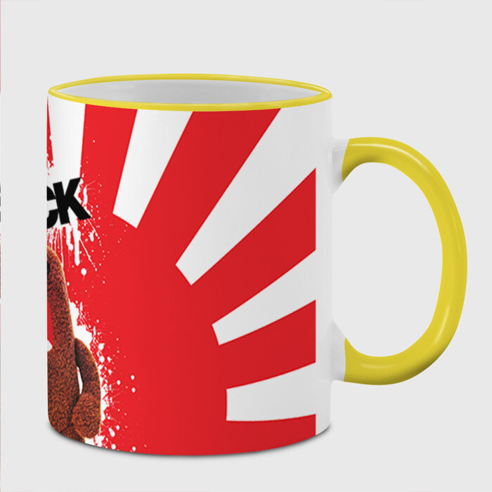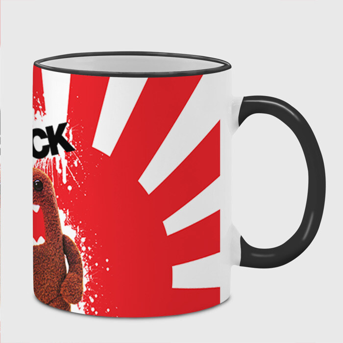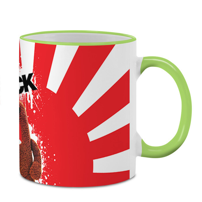 Кружка с принтом, который наносится по всей внешней поверхности, кроме прямоугольника у ручки. У кружки цветной ободок сверху и ручка. Можно заказать со своим дизайном.