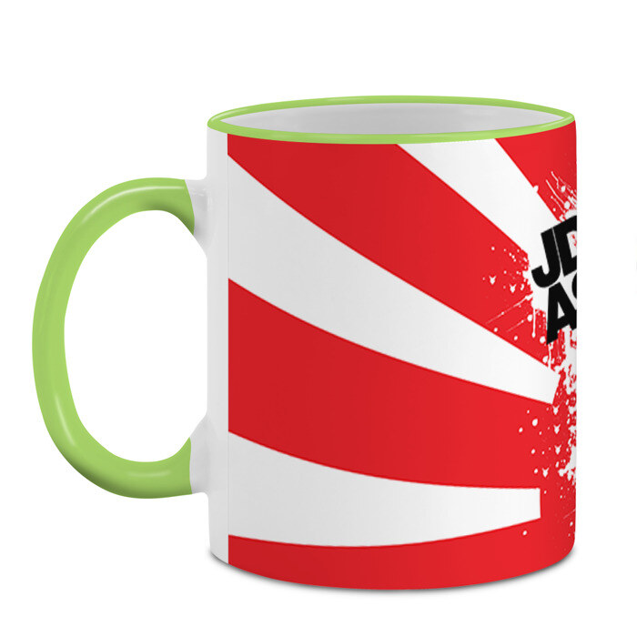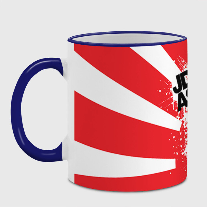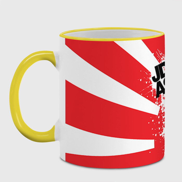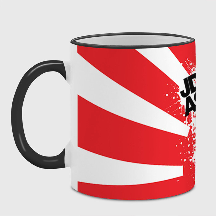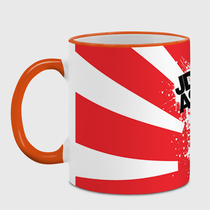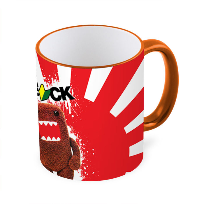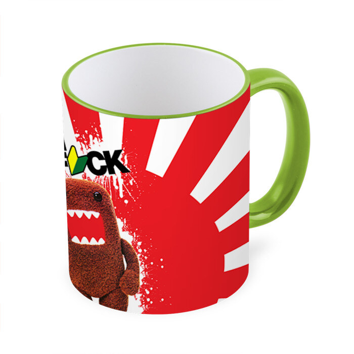Кружка с принтом, который наносится по всей внешней поверхности, кроме прямоугольника у ручки. У кружки цветной ободок сверху и ручка. Можно заказать со своим дизайном.