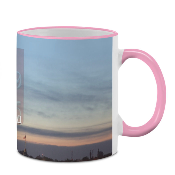 Кружка с принтом, который наносится по всей внешней поверхности, кроме прямоугольника у ручки. У кружки цветной ободок сверху и ручка. Можно заказать со своим дизайном.