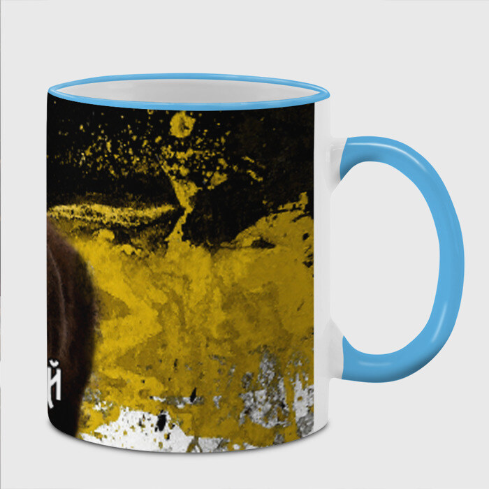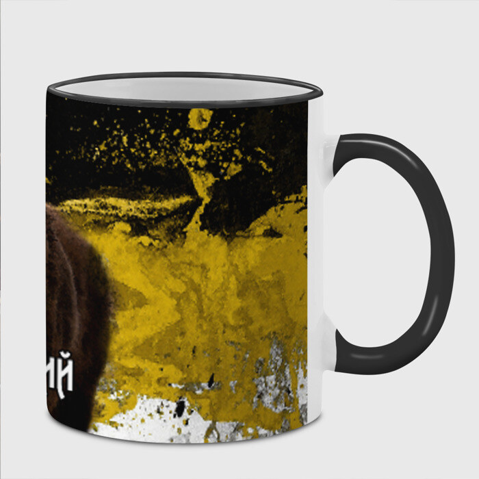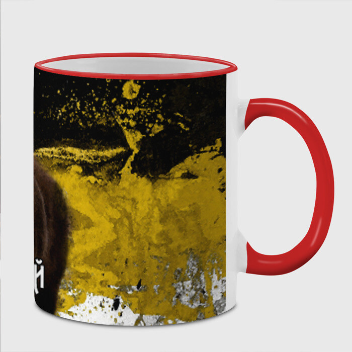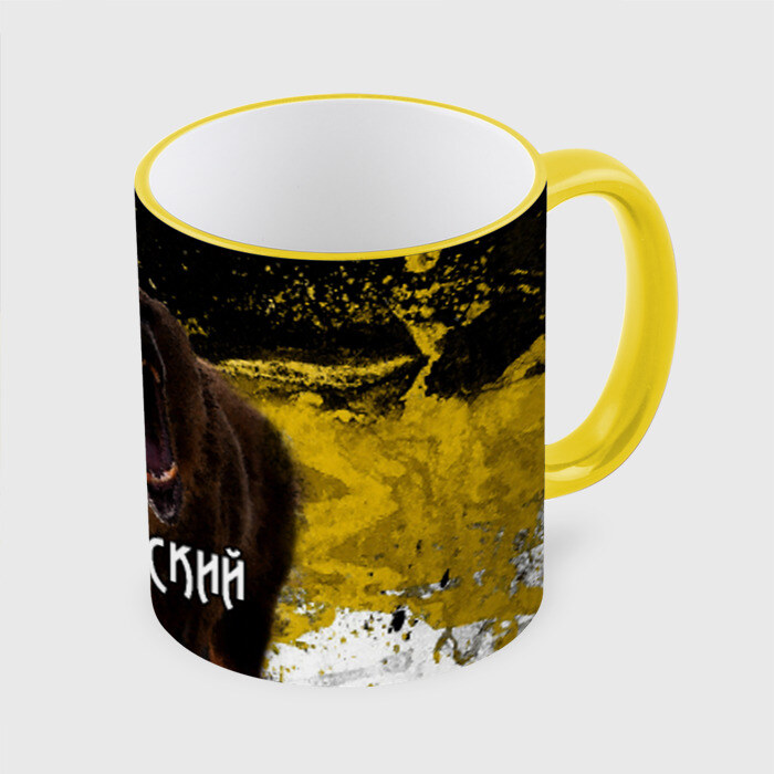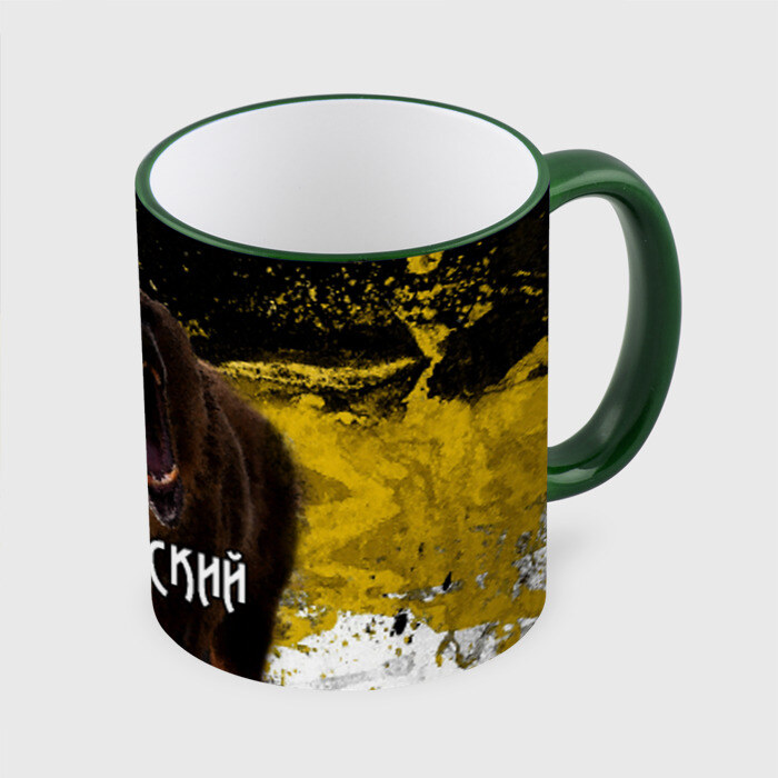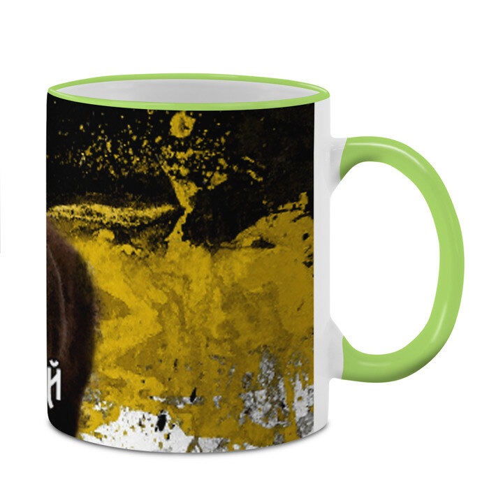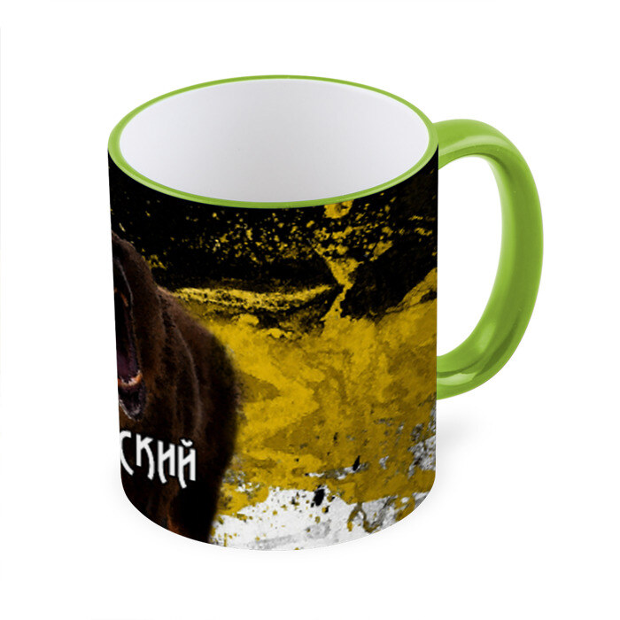 Кружка с принтом, который наносится по всей внешней поверхности, кроме прямоугольника у ручки. У кружки цветной ободок сверху и ручка. Можно заказать со своим дизайном.
