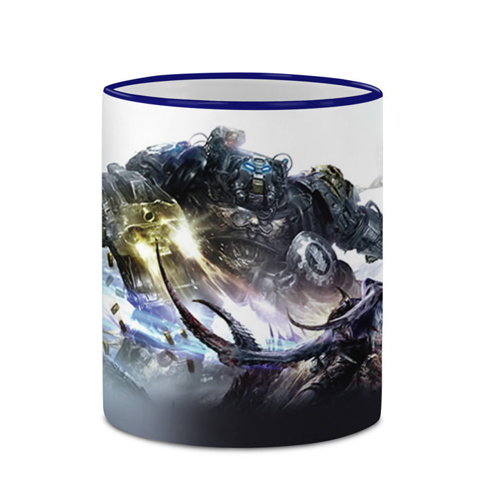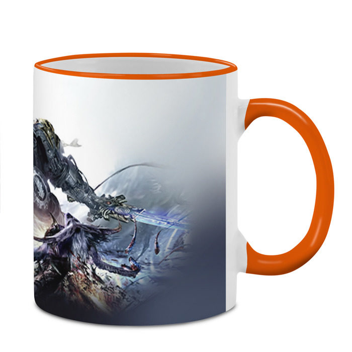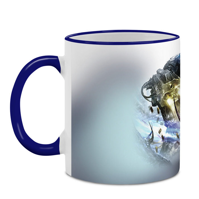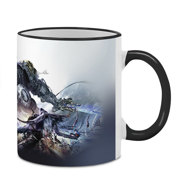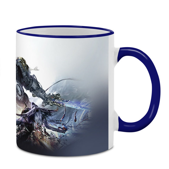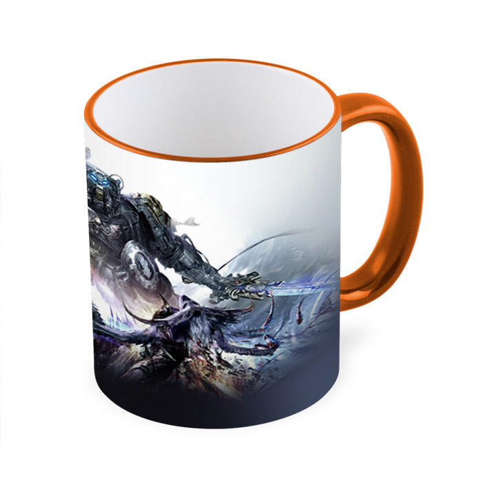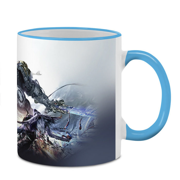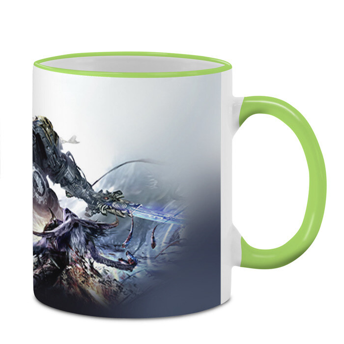 Кружка с принтом, который наносится по всей внешней поверхности, кроме прямоугольника у ручки. У кружки цветной ободок сверху и ручка. Можно заказать со своим дизайном.