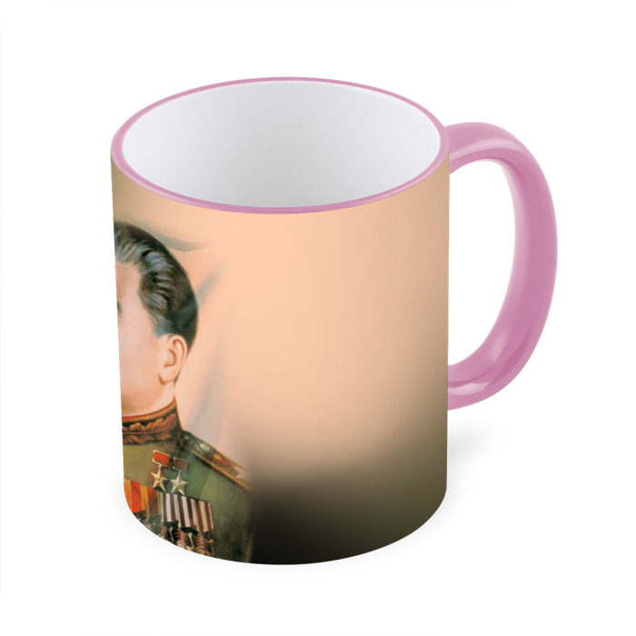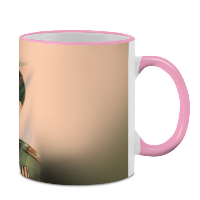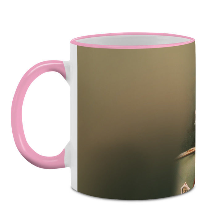 Кружка с принтом, который наносится по всей внешней поверхности, кроме прямоугольника у ручки. У кружки цветной ободок сверху и ручка. Можно заказать со своим дизайном.