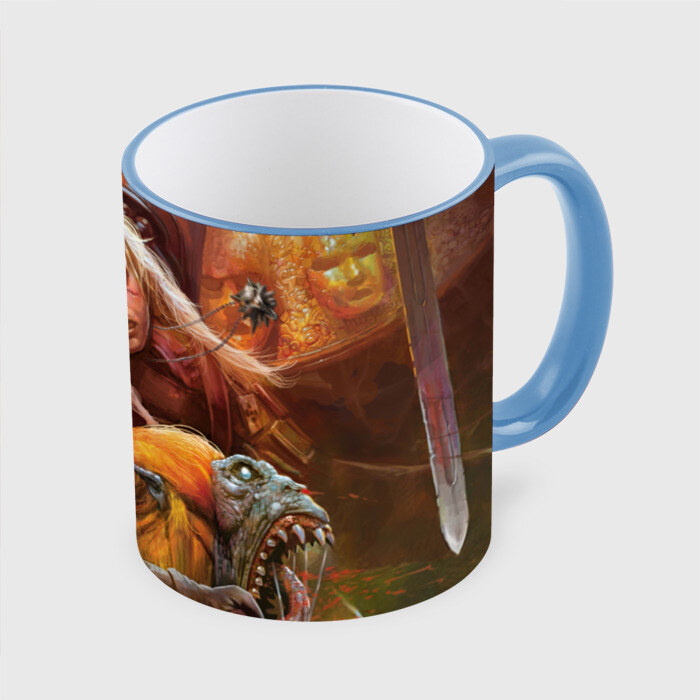 Кружка с принтом, который наносится по всей внешней поверхности, кроме прямоугольника у ручки. У кружки цветной ободок сверху и ручка. Можно заказать со своим дизайном.