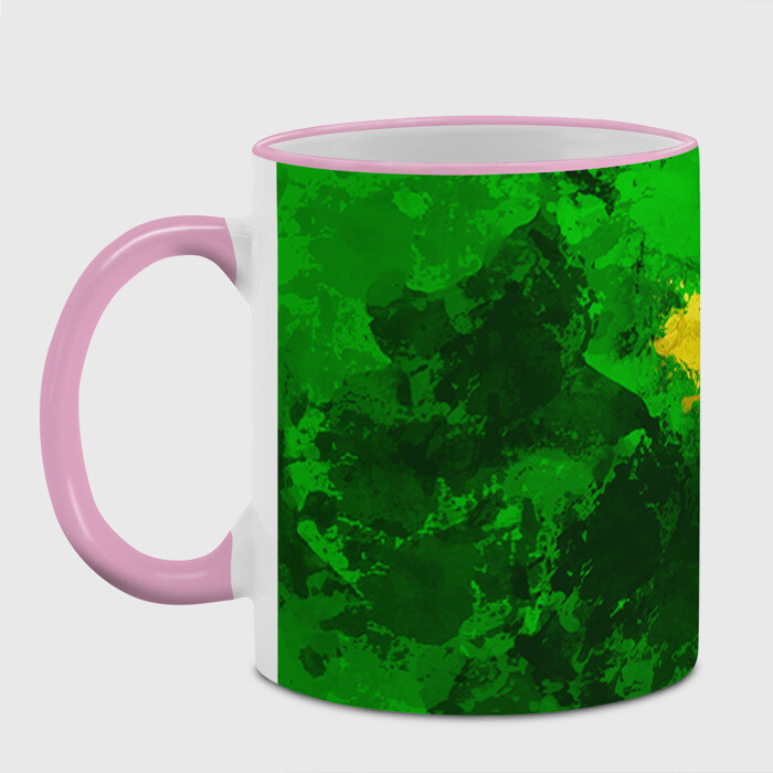 Кружка с принтом, который наносится по всей внешней поверхности, кроме прямоугольника у ручки. У кружки цветной ободок сверху и ручка. Можно заказать со своим дизайном.