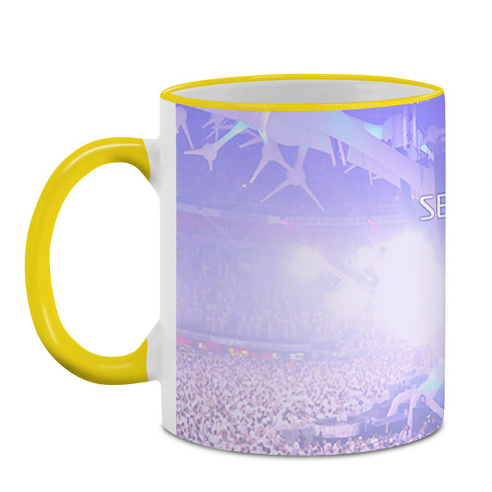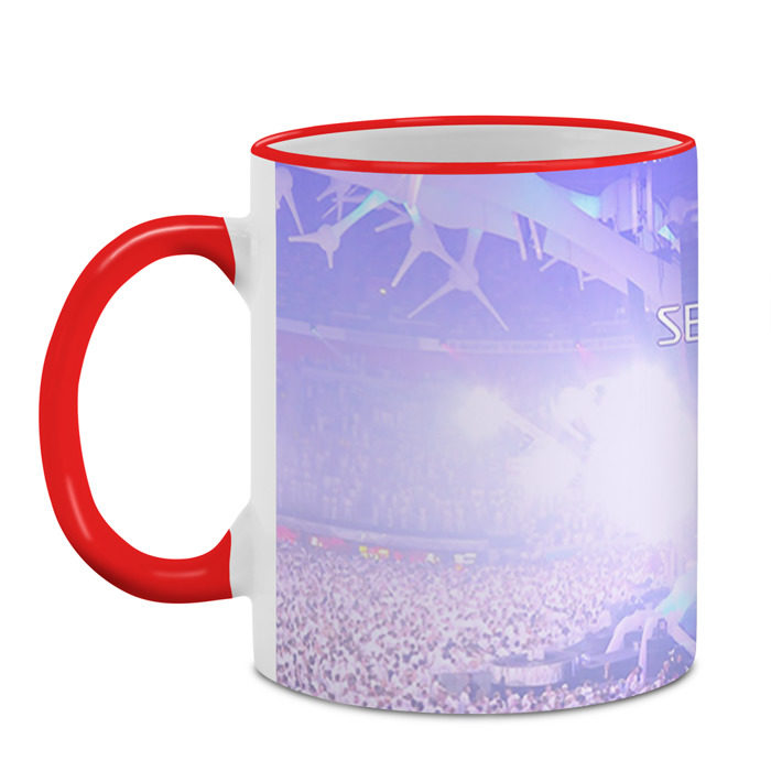 Кружка с принтом, который наносится по всей внешней поверхности, кроме прямоугольника у ручки. У кружки цветной ободок сверху и ручка. Можно заказать со своим дизайном.