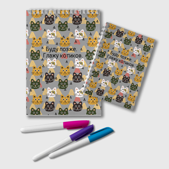 Блокнот на спирали в двух размерах: А5 с пружинкой сверху или А6 с пружинкой сбоку. Есть блокноты в клетку, просто с белыми страницами, с точками и в крупную клетку. Такие блокноты сделают жизнь веселее, потому что теперь их можно купить с самыми разными принтами и даже со своим дизайном.