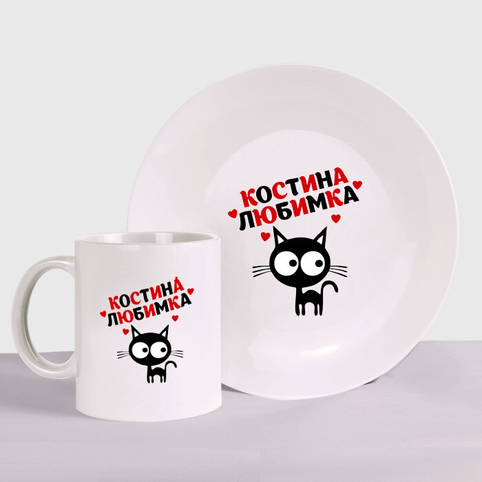 Кружка изготовлена из высококачественной белой керамики. Тарелка изготовлена из фарфора. Принт наносится на бока кружки: два изображения или только с одной стороны. На тарелку принт наносится на плоскую часть.