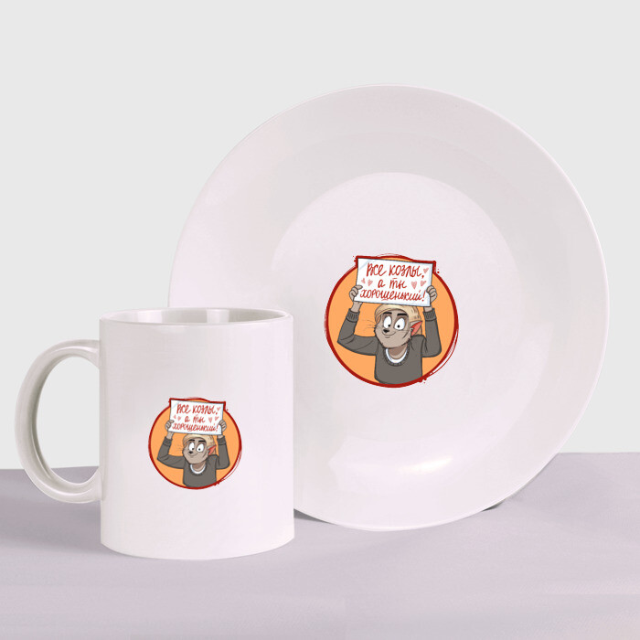 Набор: тарелка + кружка с принтом Все козлы, а ты хорошенький!