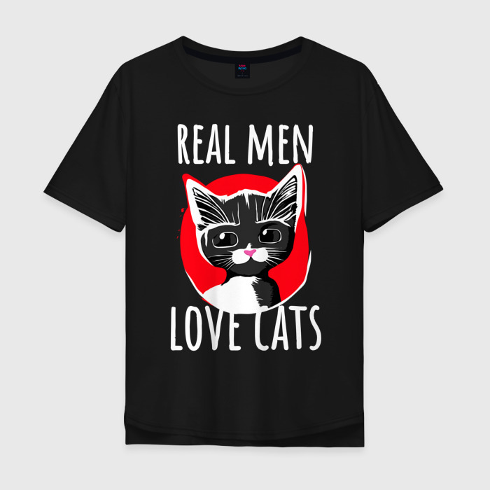 Мужская футболка хлопок Oversize с принтом Real Men Love Cats Темный фон