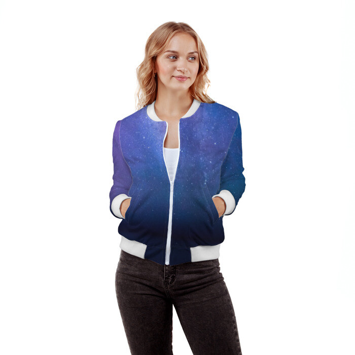 Бомбер — это короткая куртка на молнии, с эластичными вставками-резинками и манжетами. Удобный трендовый аксессуар, сшитый из комфортной синтетической ткани, на всей поверхности которой наносится принт. Можно сделать со своим дизайном.