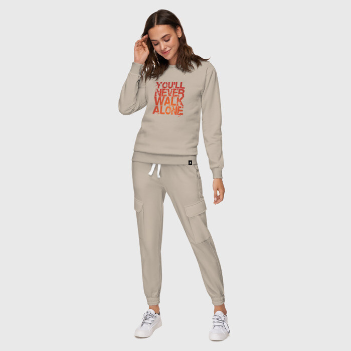 Костюм из мягкого хлопка с мягким и теплым начесом внутри. Базовая вещь в гардеробе, которую можно сочетать с другими вещами: например, брюки надеть с другой футболкой, верх носить отдельно. Пара выполнена из хлопка одного цвета, а брюки сшиты из той же ткани, что и базовый хлопковый свитшот . Брюки на поясе фиксируются не только широкой трикотажной резинкой, но и дополнительными завязками. Принт наносится только на свитшот. Можно заказать как со своим дизайном, так и вообще без него.