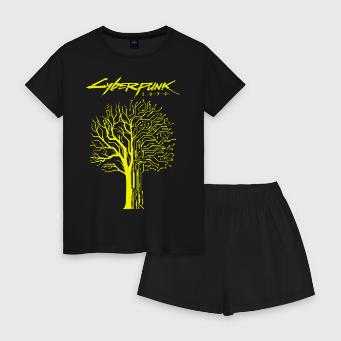 Женская пижама с шортиками хлопок с принтом ДЕРЕВО CYBERPUNK 2077.