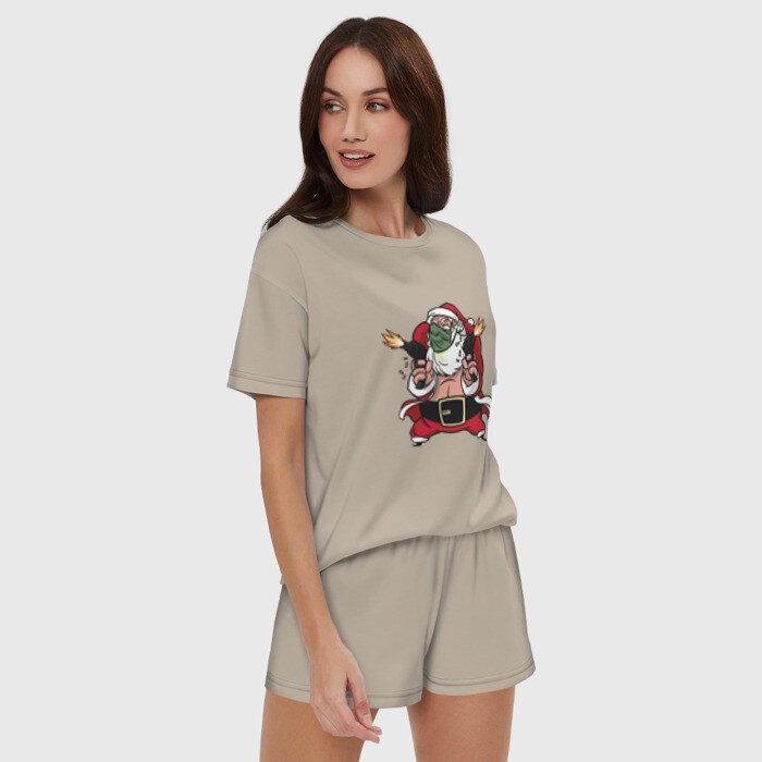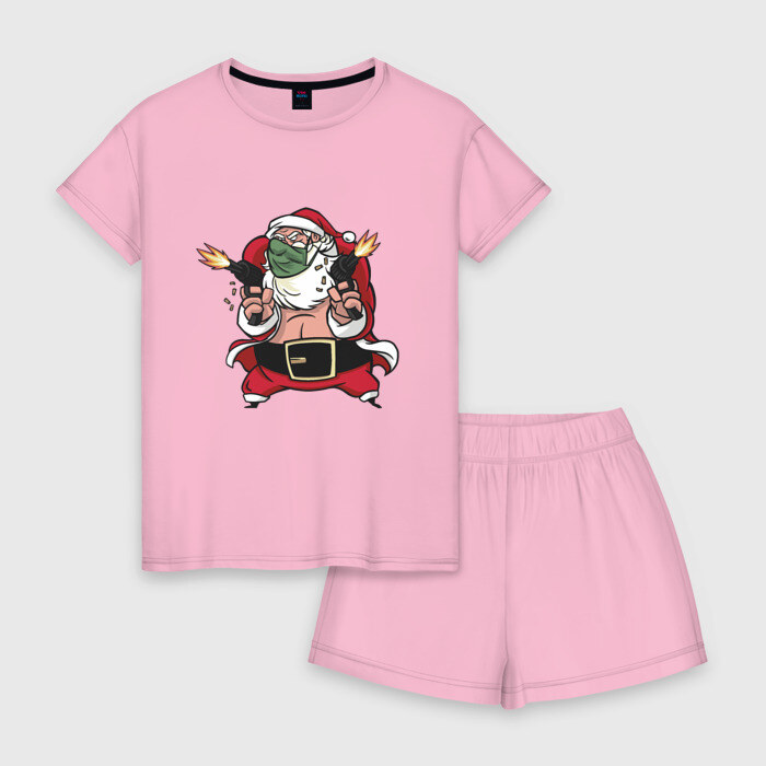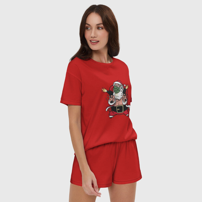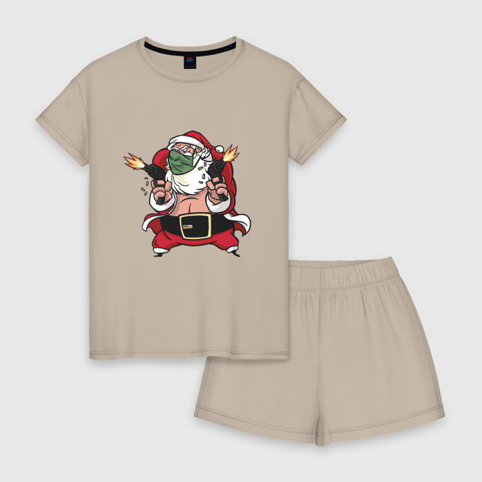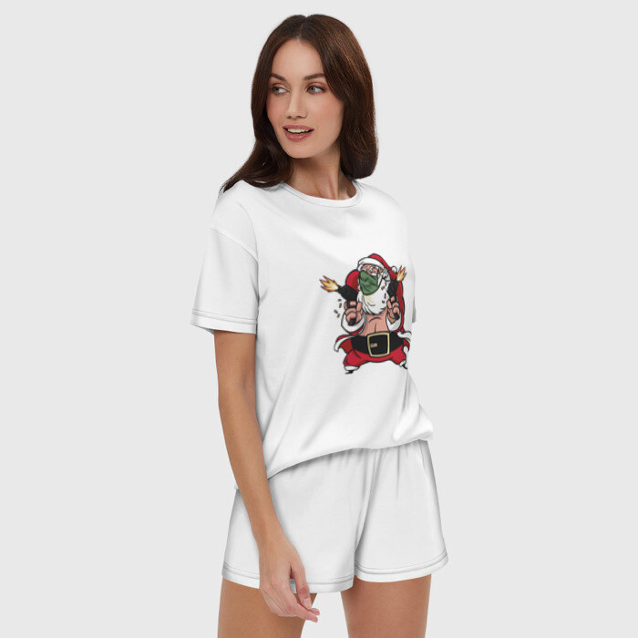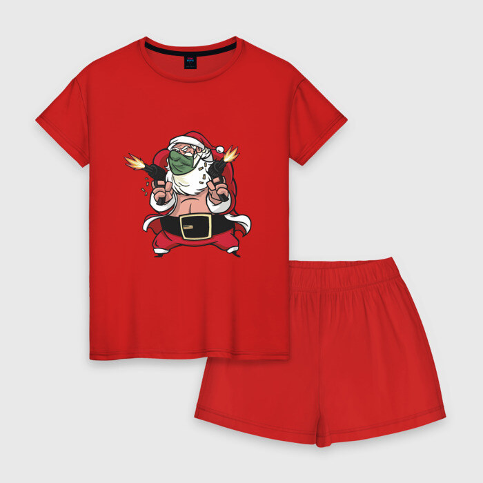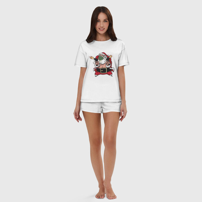 Женская пижама с шортиками хлопок с принтом Злой Санта с пулемётами