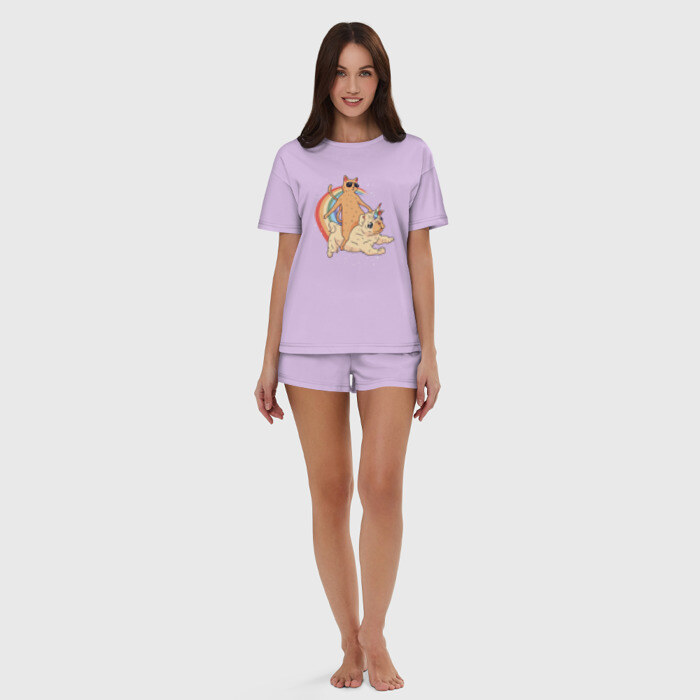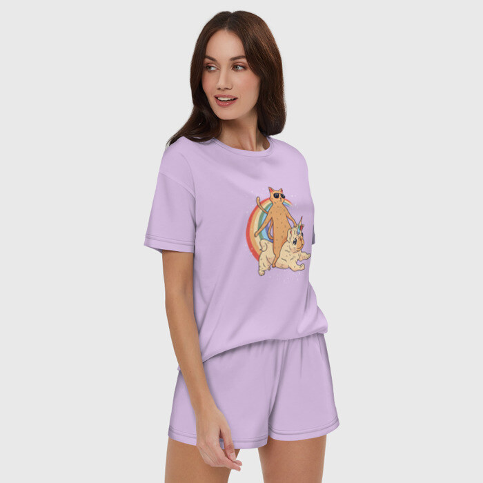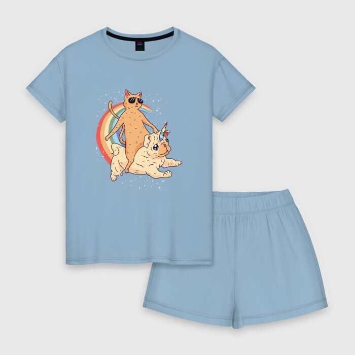 Женская пижама с шортиками хлопок с принтом Кот верхом на мопсе единороге