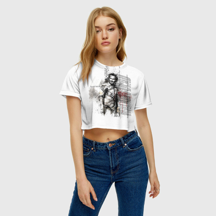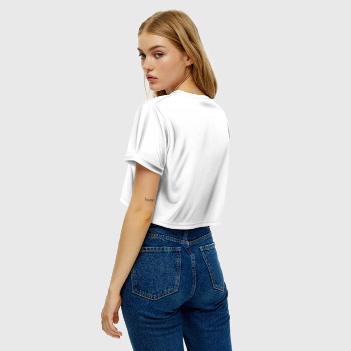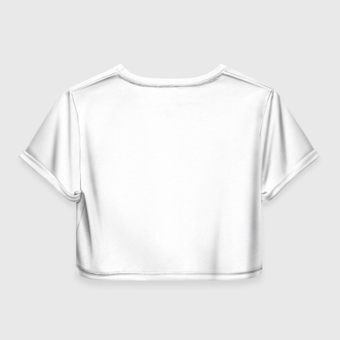 Укороченная футболка, которая открывает талию, пупок и живот. Футболка сшита из мягкой синтетической ткани, по всей поверхности которой наносится принт. Можно сделать со своим дизайном.