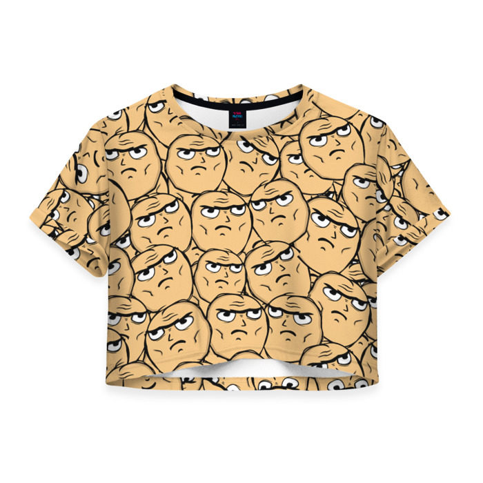 Укороченная футболка, которая открывает талию, пупок и живот. Футболка сшита из мягкой синтетической ткани, по всей поверхности которой наносится принт. Можно сделать со своим дизайном.