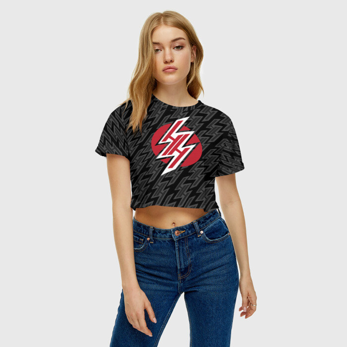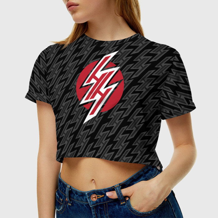 Укороченная футболка, которая открывает талию, пупок и живот. Футболка сшита из мягкой синтетической ткани, по всей поверхности которой наносится принт. Можно сделать со своим дизайном.