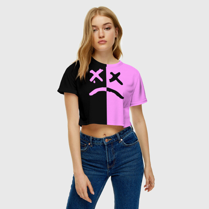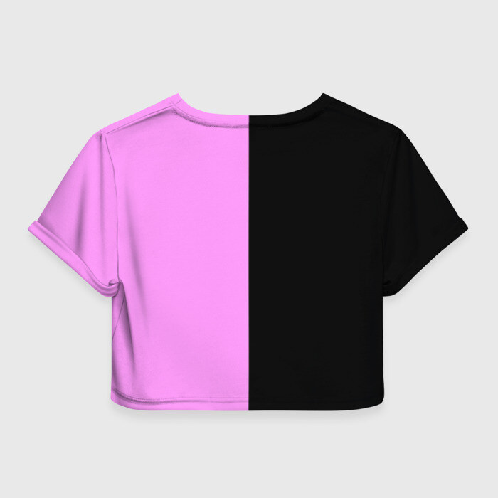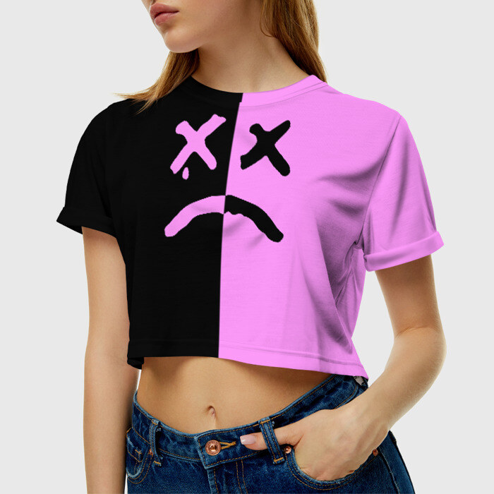 Укороченная футболка, которая открывает талию, пупок и живот. Футболка сшита из мягкой синтетической ткани, по всей поверхности которой наносится принт. Можно сделать со своим дизайном.