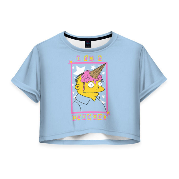 Укороченная футболка, которая открывает талию, пупок и живот. Футболка сшита из мягкой синтетической ткани, по всей поверхности которой наносится принт. Можно сделать со своим дизайном.