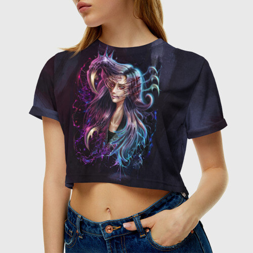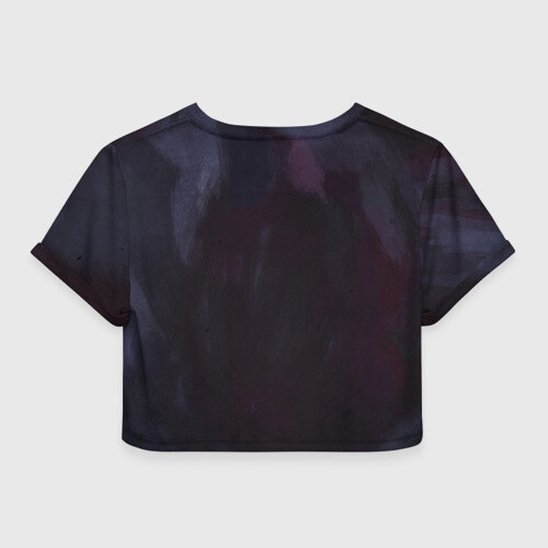 Укороченная футболка, которая открывает талию, пупок и живот. Футболка сшита из мягкой синтетической ткани, по всей поверхности которой наносится принт. Можно сделать со своим дизайном.