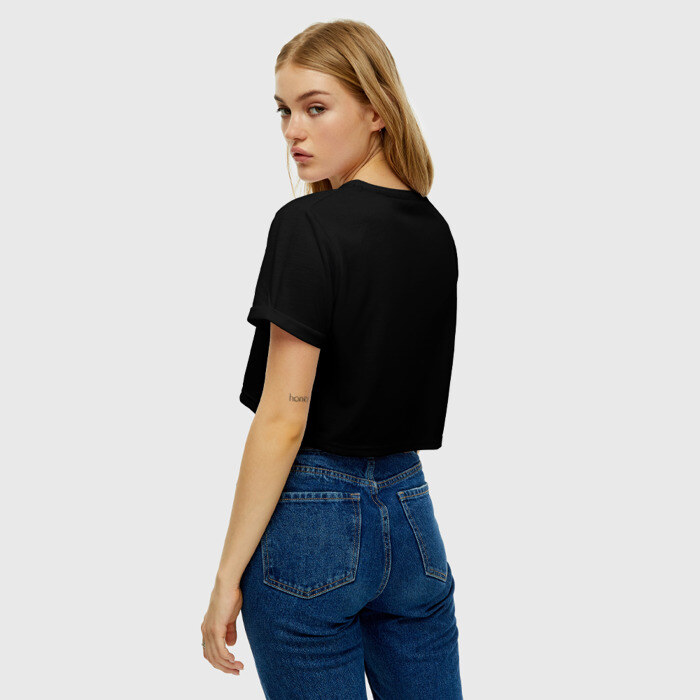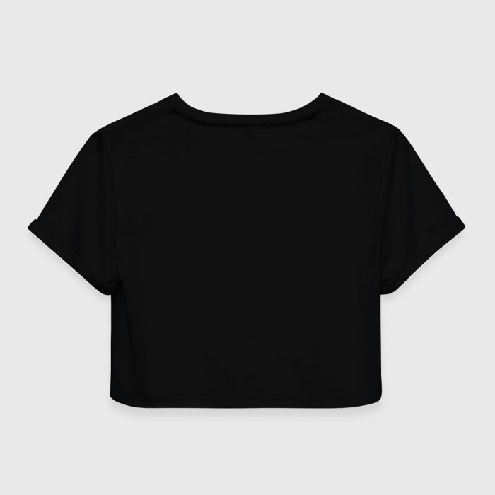 Укороченная футболка, которая открывает талию, пупок и живот. Футболка сшита из мягкой синтетической ткани, по всей поверхности которой наносится принт. Можно сделать со своим дизайном.