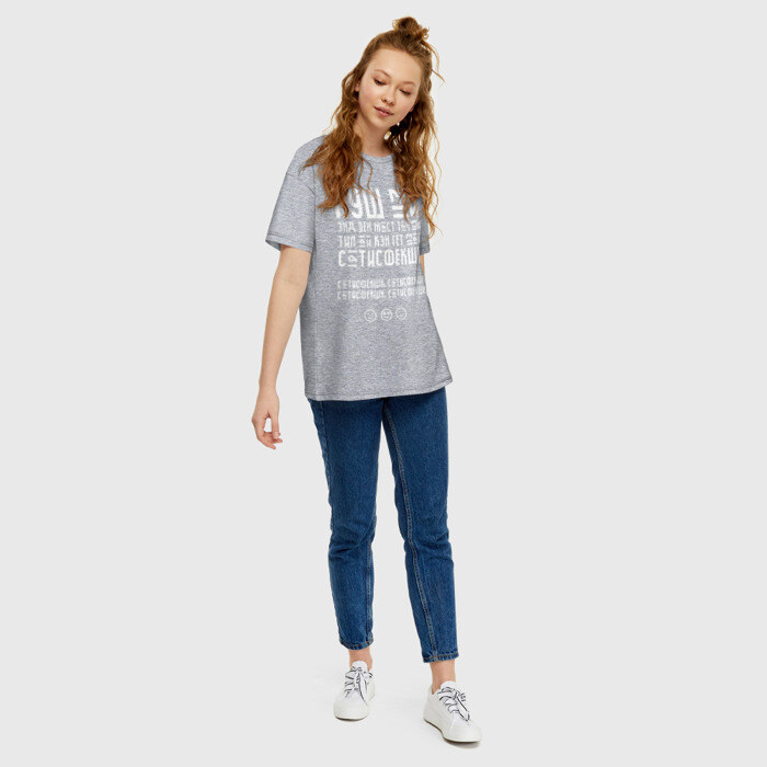 Футболка свободного кроя со спущенными рукавами, длина до линии бедер. Свободный крой позволяет носить футболку и с брюками, и с джинсами. Выполнена из 100% хлопка, благодаря чему кожа дышит и не раздражается. Принт нанесен методом прямой печати, что позволяет сохранить цвет и яркость после многочисленных стирок. Сделано в России.