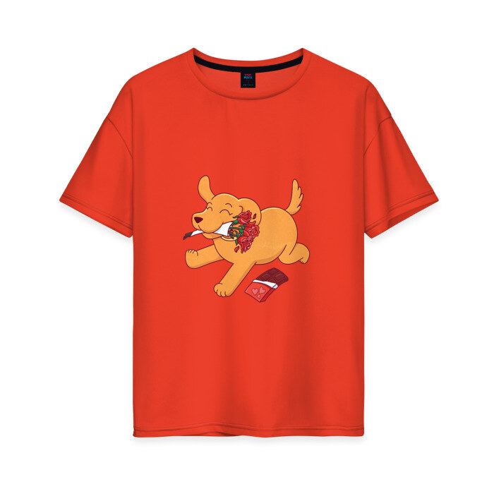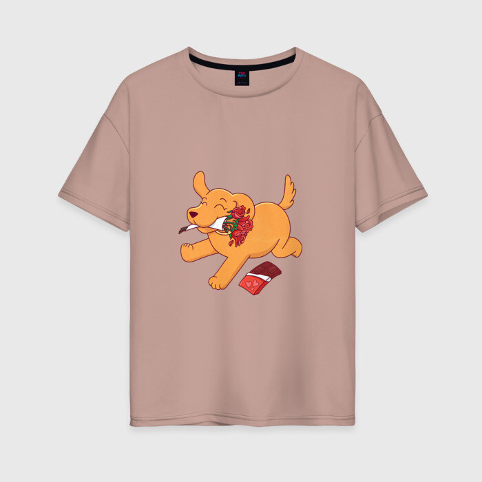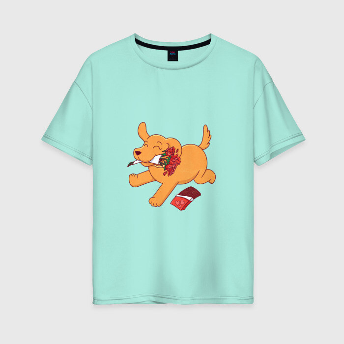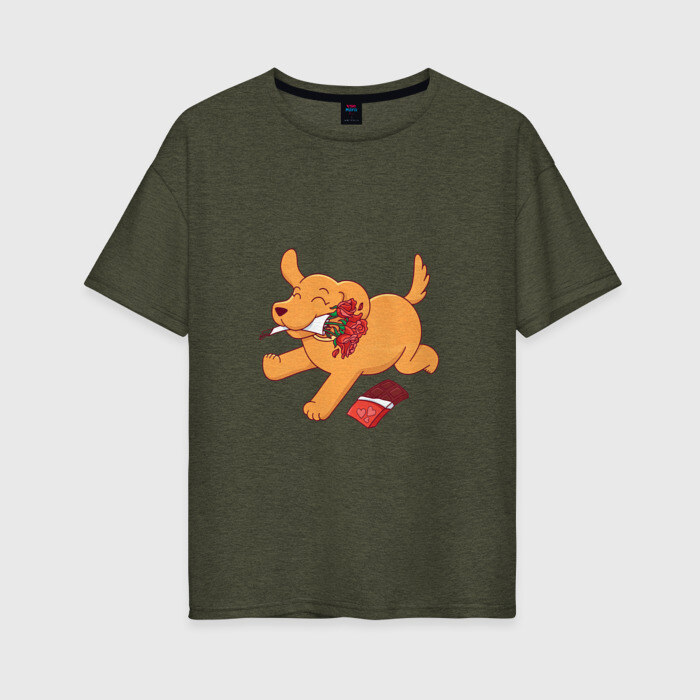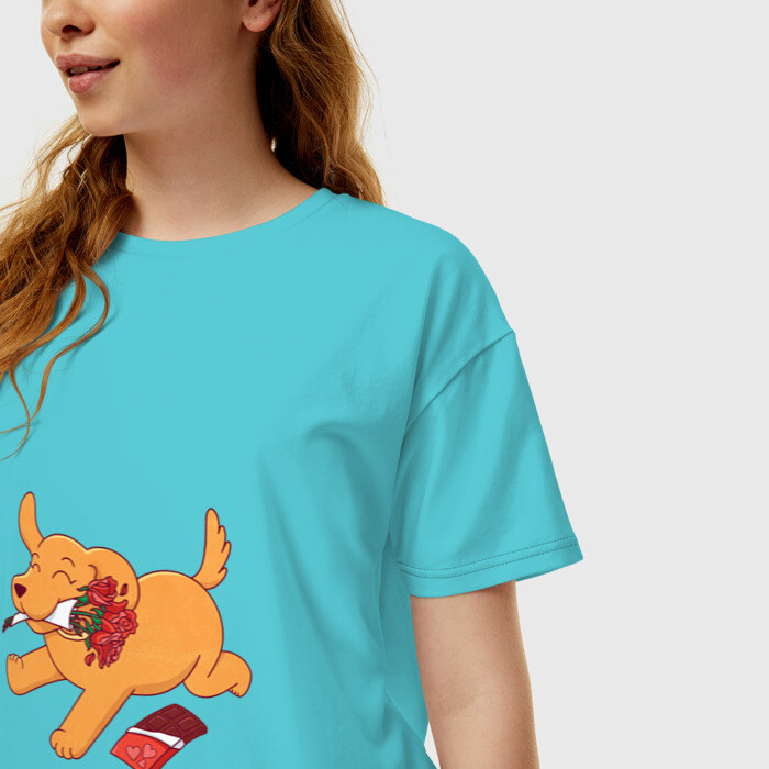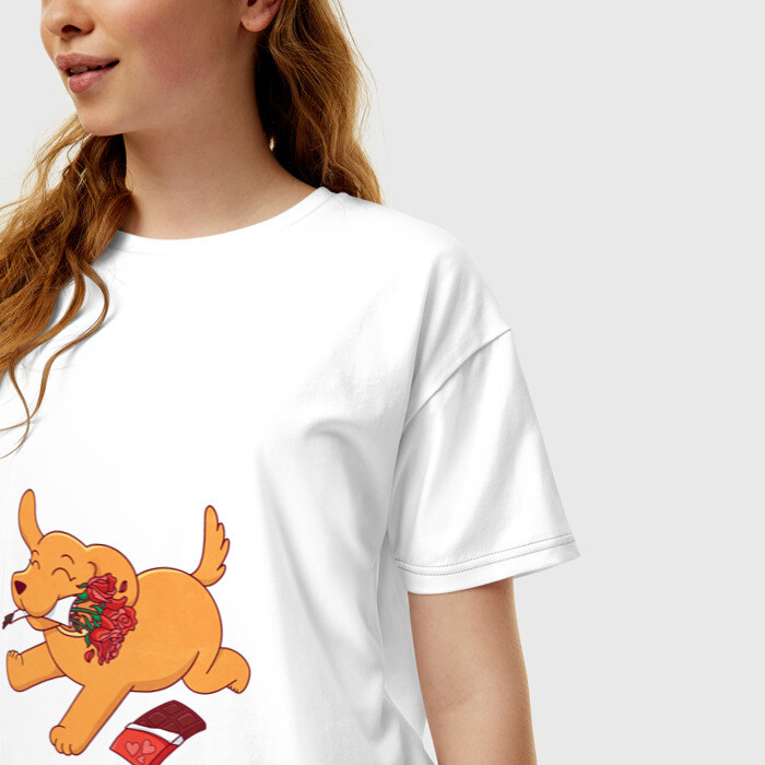 Женская футболка хлопок Oversize с принтом Собака с цветами и шоколадкой