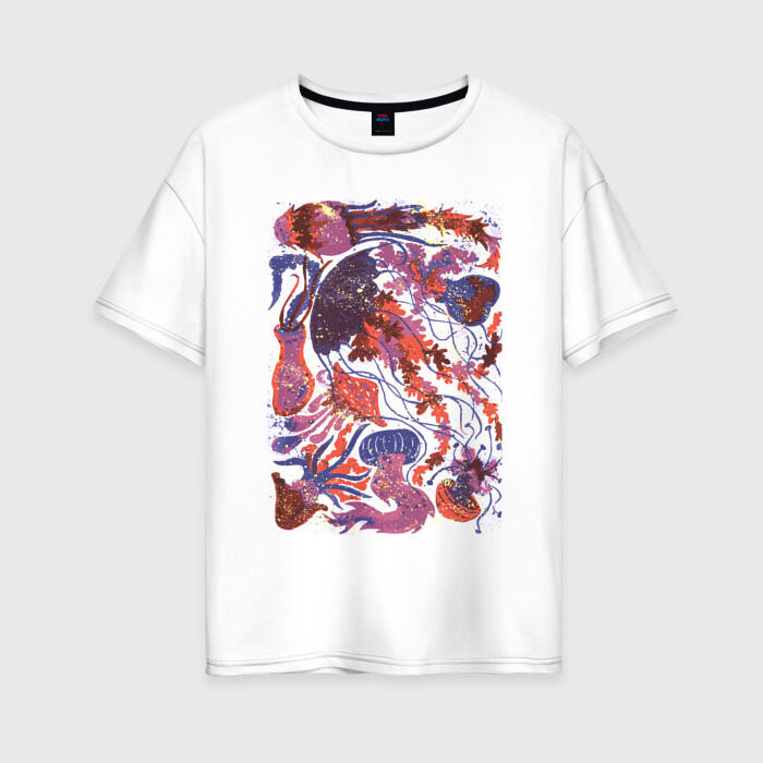 Футболка свободного кроя со спущенными рукавами, длина до линии бедер. Свободный крой позволяет носить футболку и с брюками, и с джинсами. Выполнена из 100% хлопка, благодаря чему кожа дышит и не раздражается. Принт нанесен методом прямой печати, что позволяет сохранить цвет и яркость после многочисленных стирок. Сделано в России.